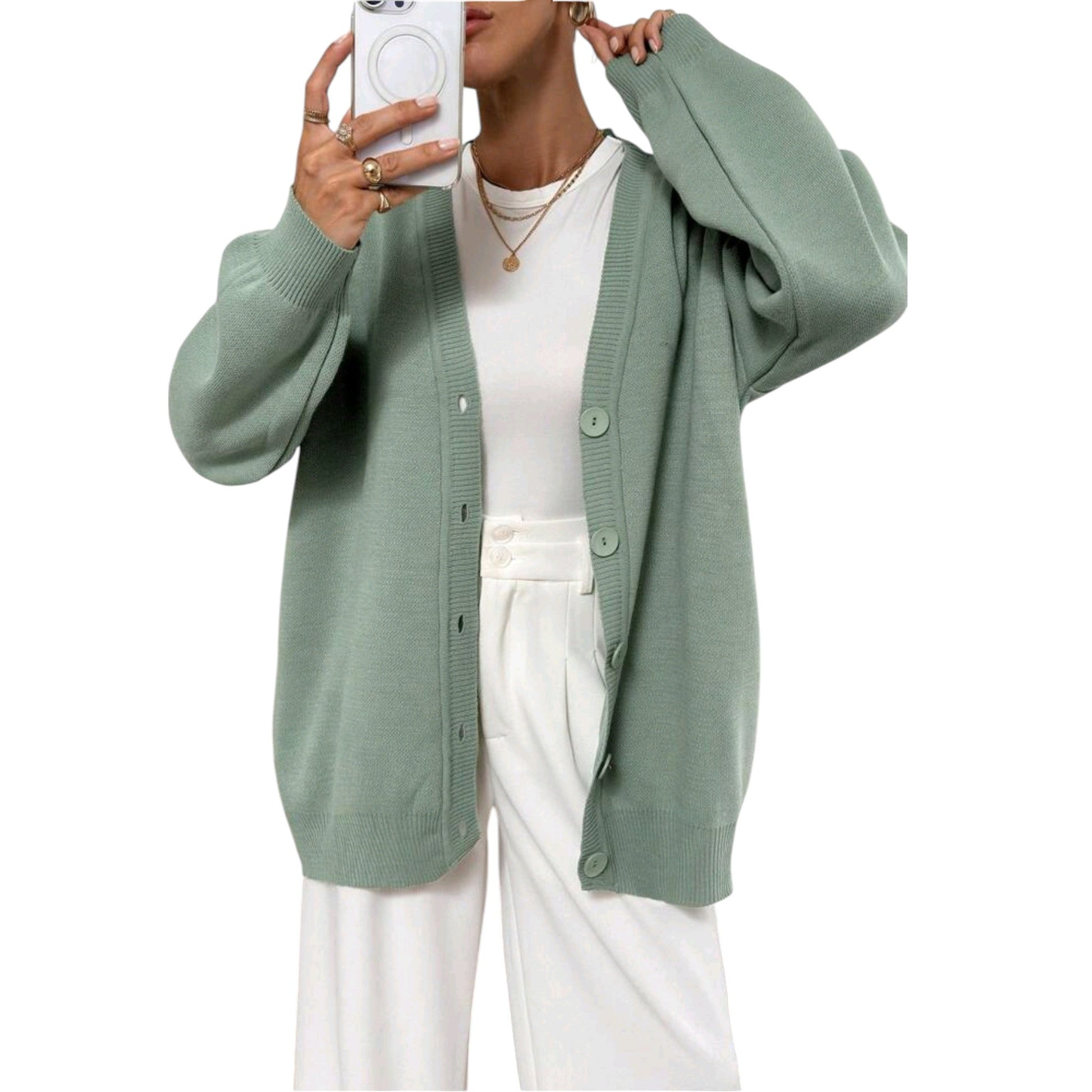 Címke nélküli, mentazöld, sima kötésű, V-nyakú, gombos, hosszú ujjú, bő szabású.