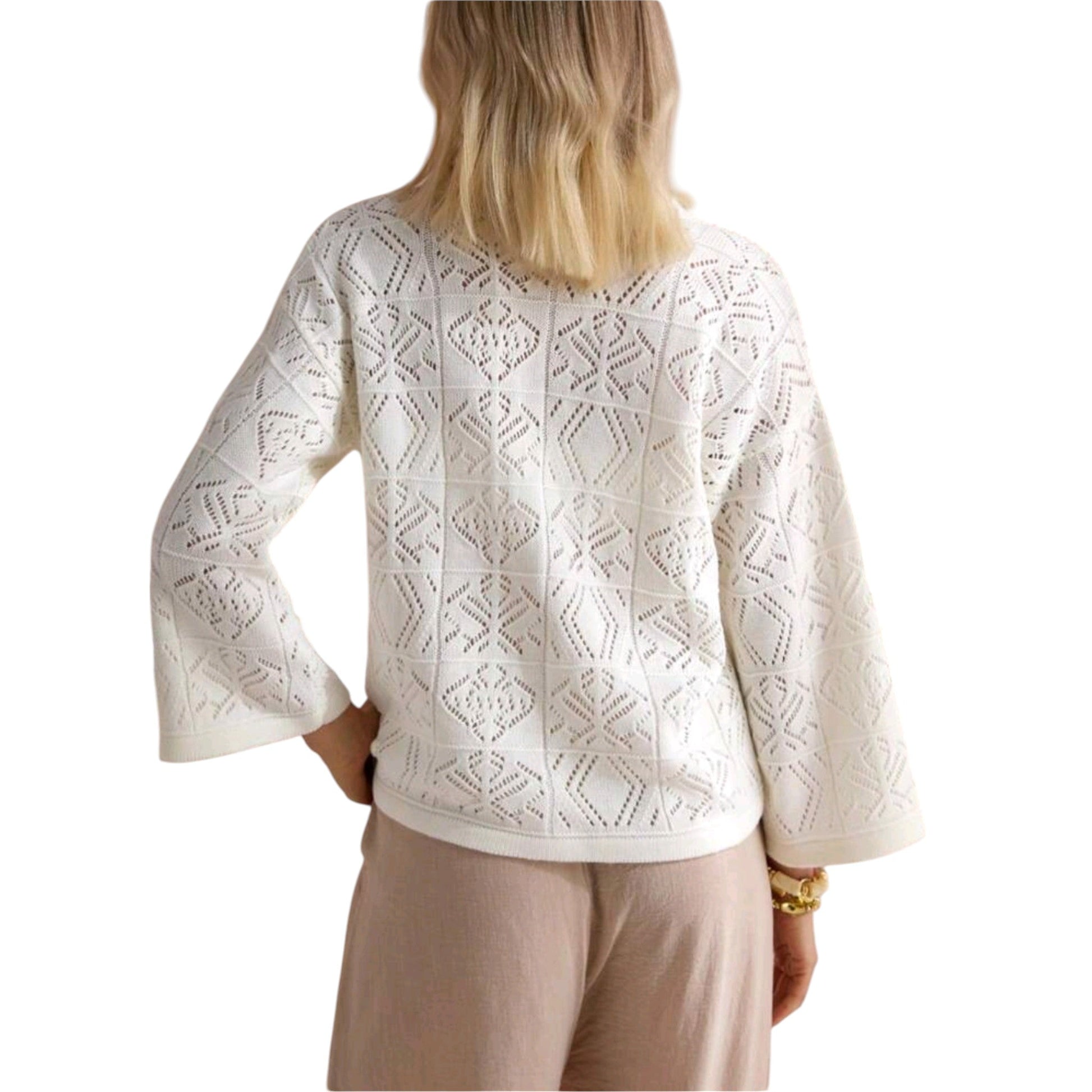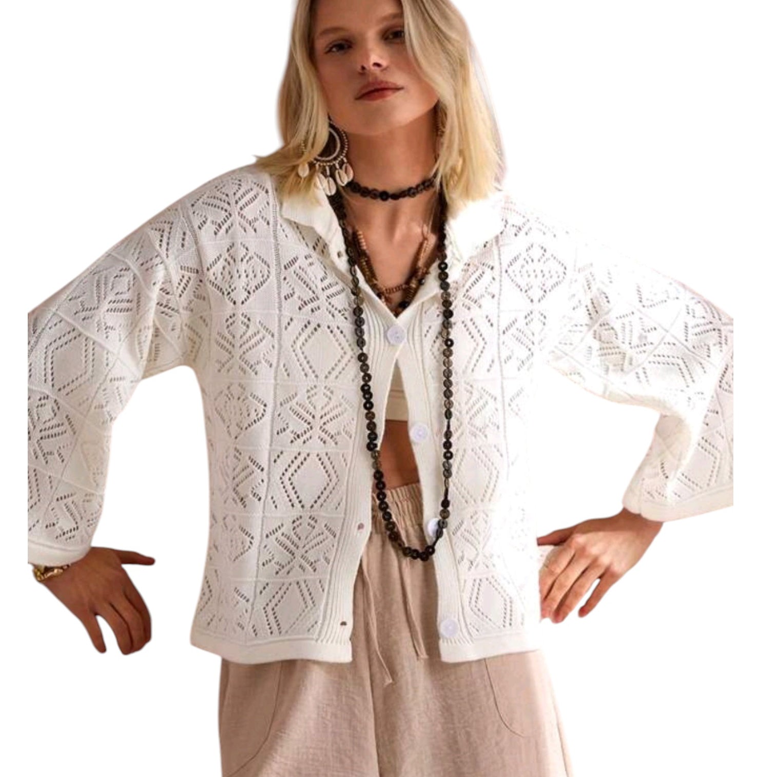 Címke nélküli, fehér, áttört mintás, hosszú harangujjú, galléros, gombos.