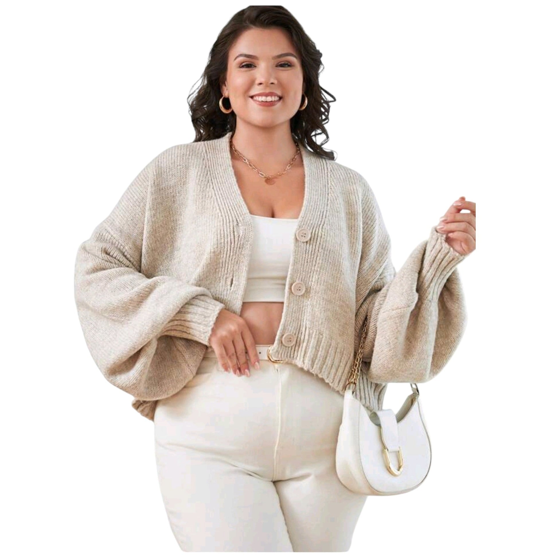 Címke nélküli, bézs, bordázott kötésű, V-nyakú, gombos, bő ujjú, rövid szabású.