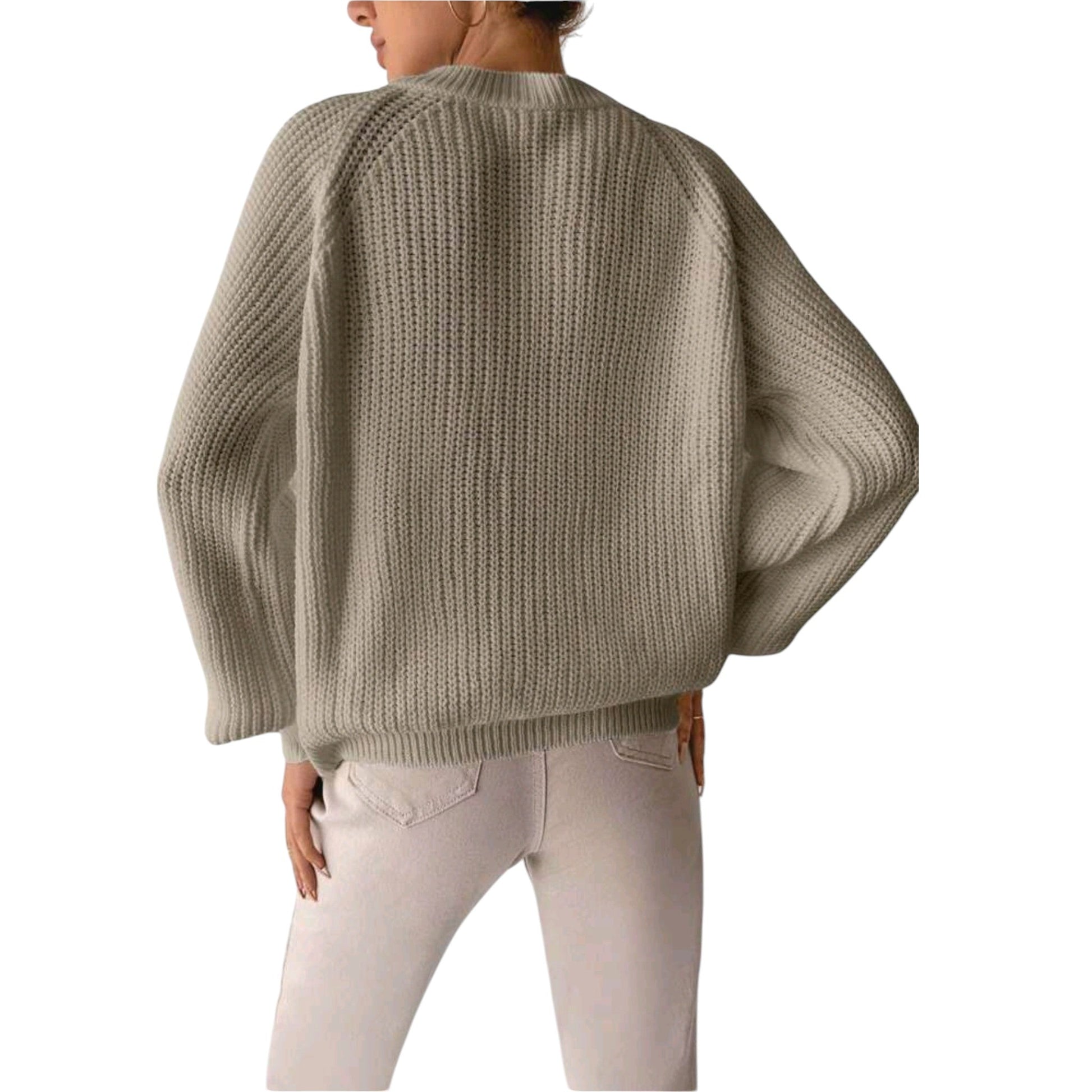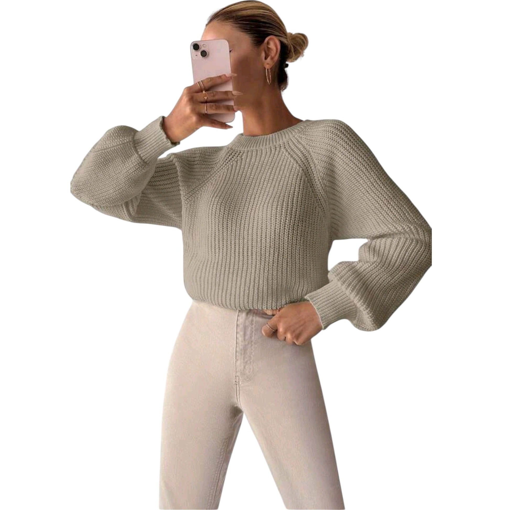 Címke nélküli, bézs színű, kötött, kerek nyakú, hosszú puffos ujjú, bordázott passzé.