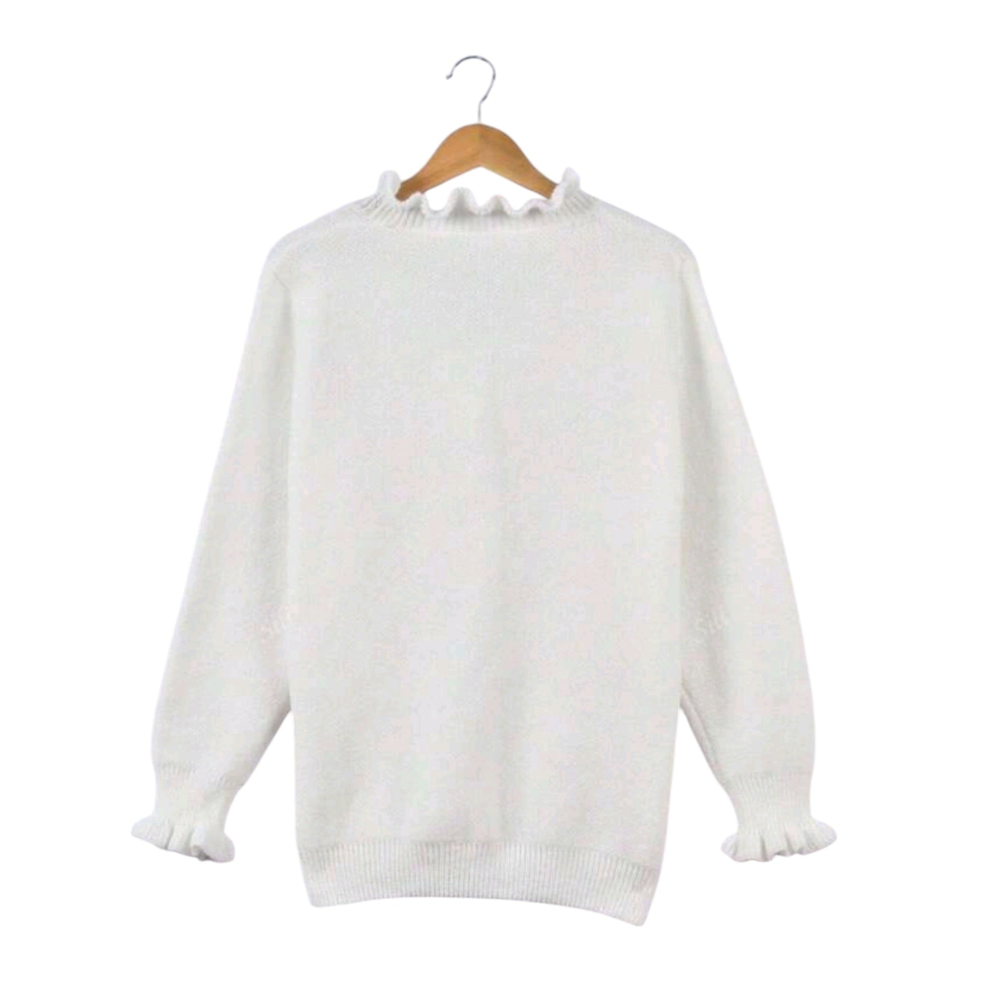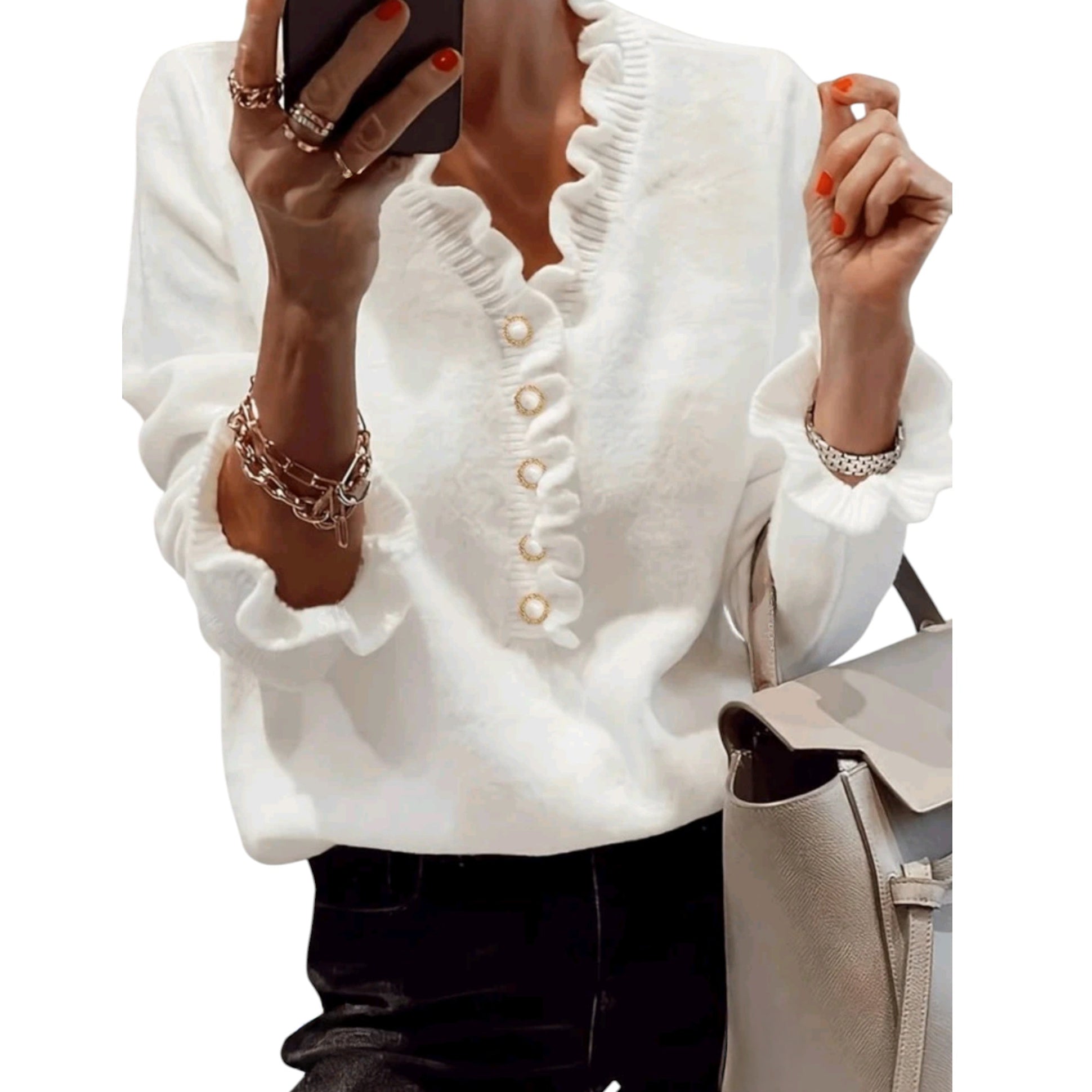 Címke nélküli, fehér színű, kötött, fodros V-nyakú, gombos, hosszú fodros ujjú.