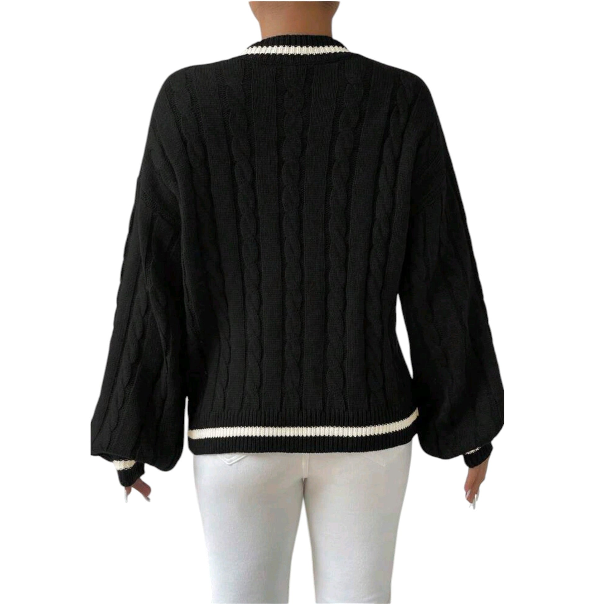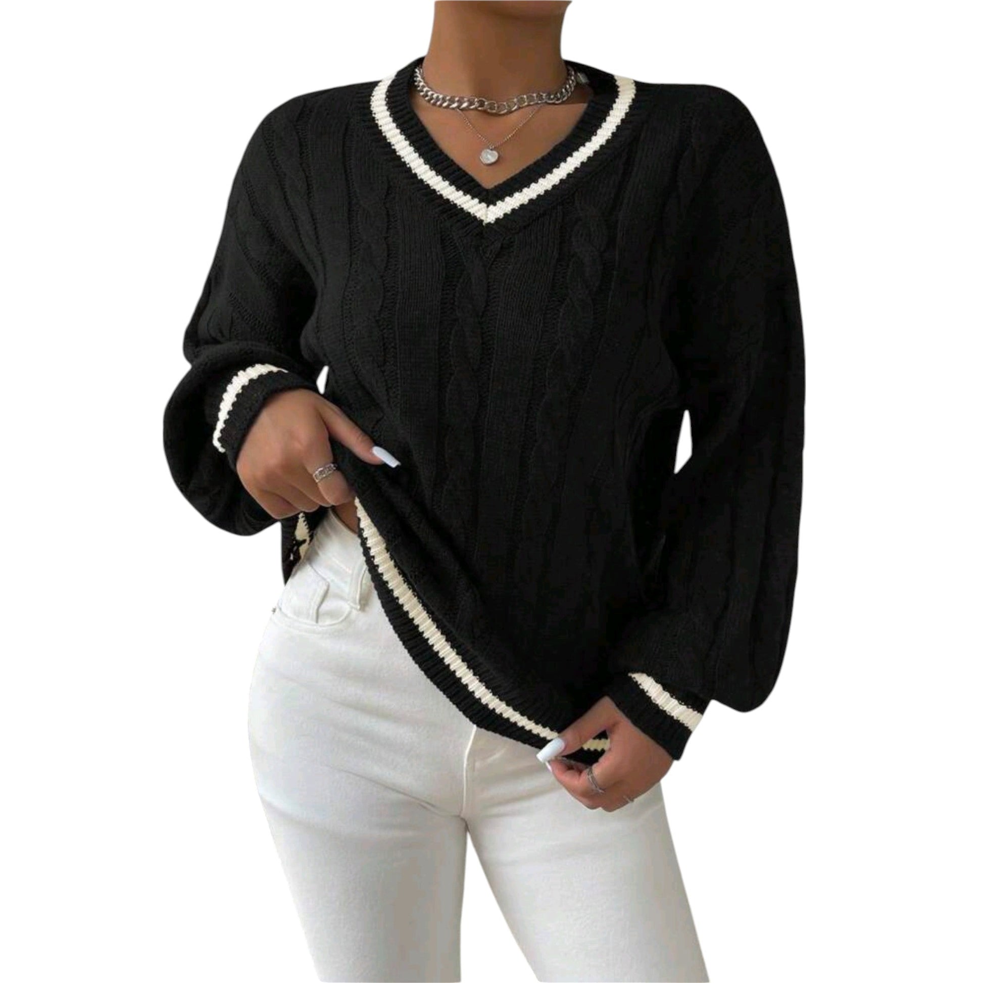 Címke nélküli, fekete, V-nyakú, fehér csíkos díszítéssel a nyakkivágásnál és az ujjak végén, kötött.