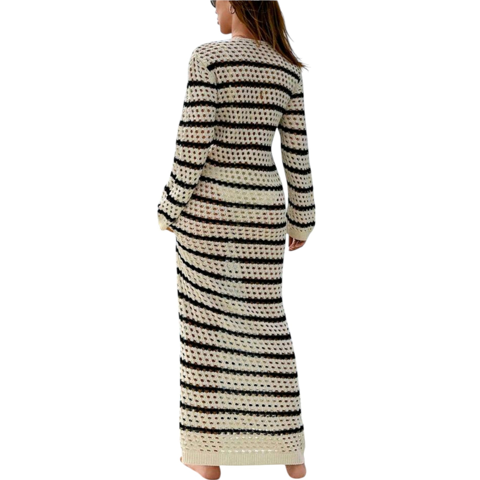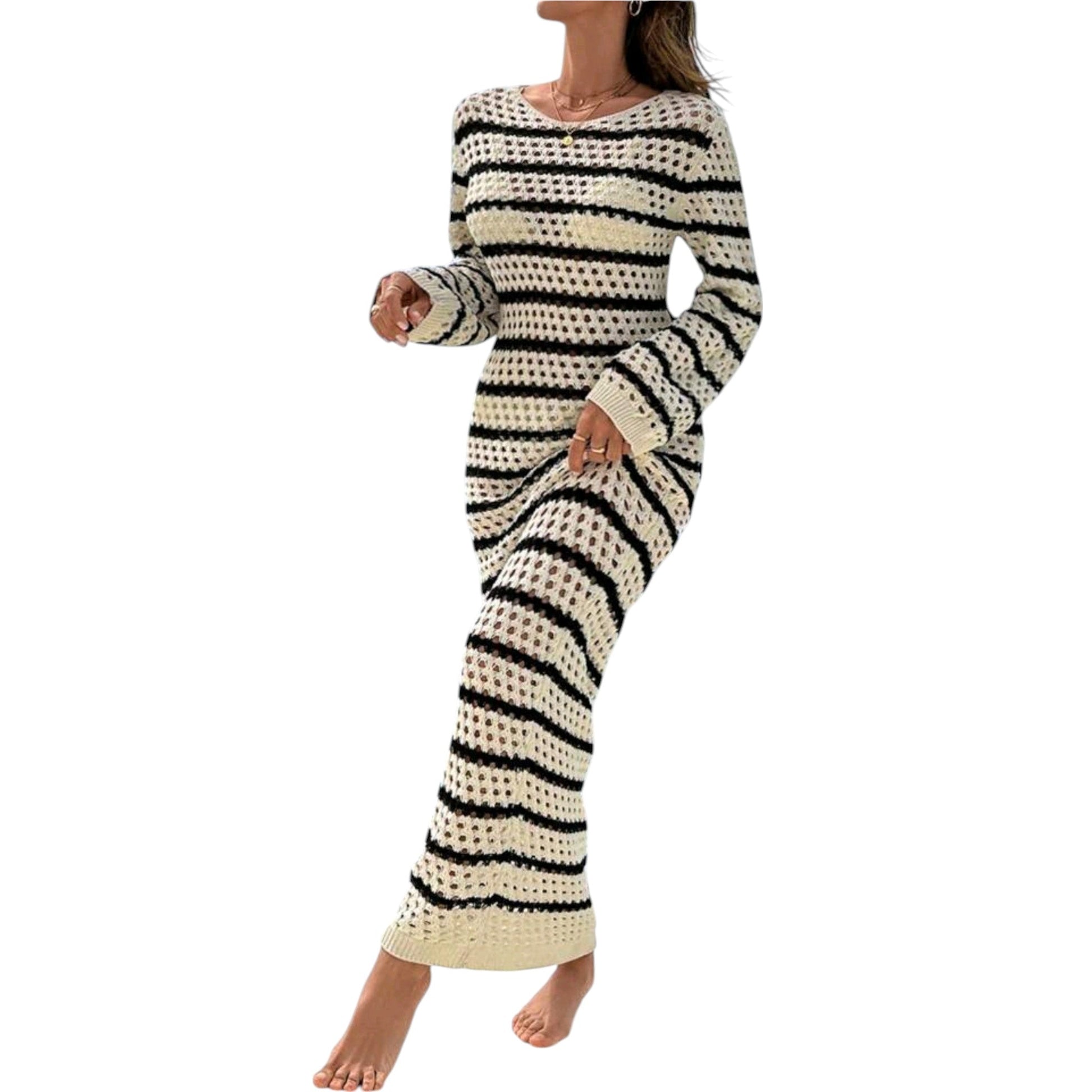Címke nélküli, bézs és fekete, hosszú ujjú, kötött, áttetsző, maxi ruha.