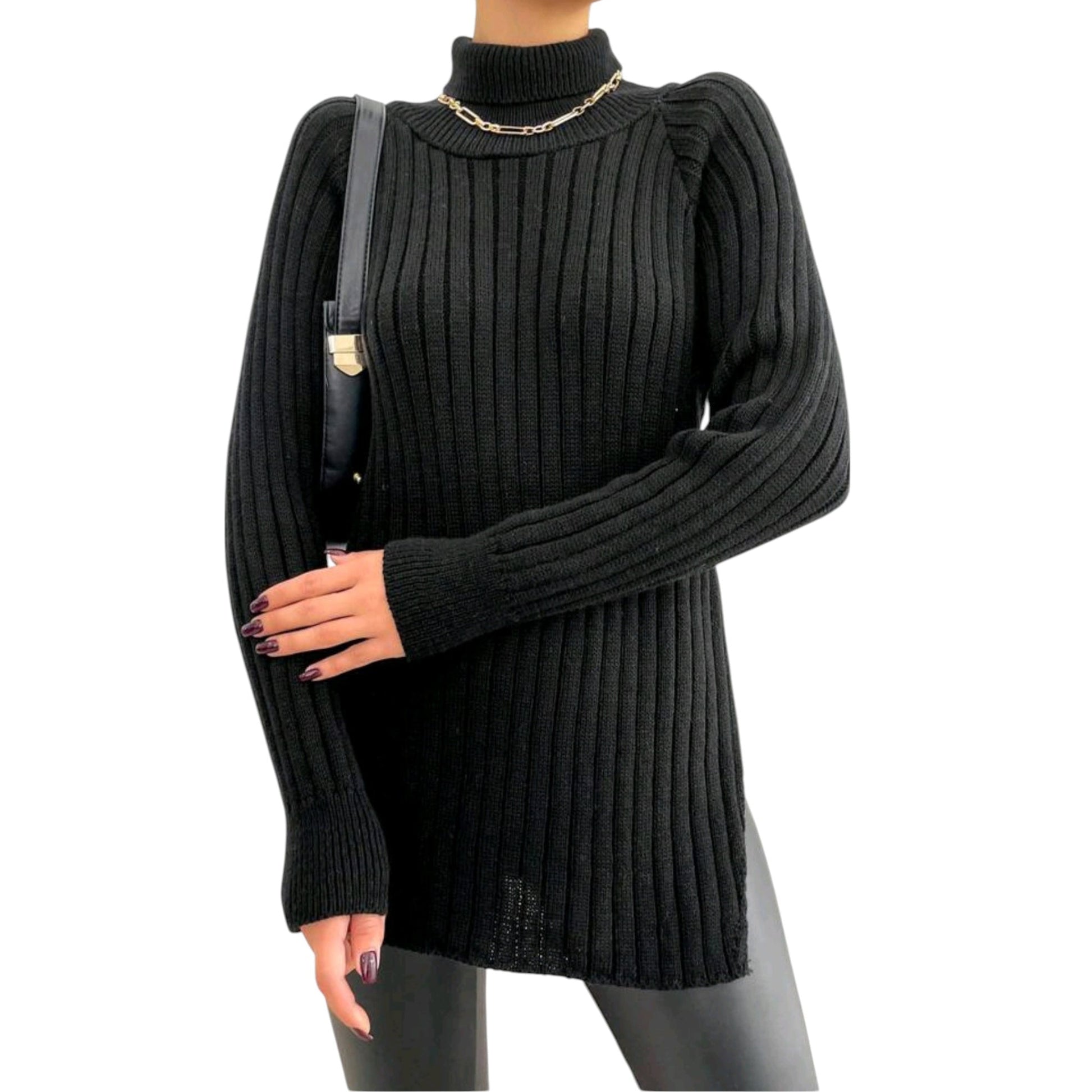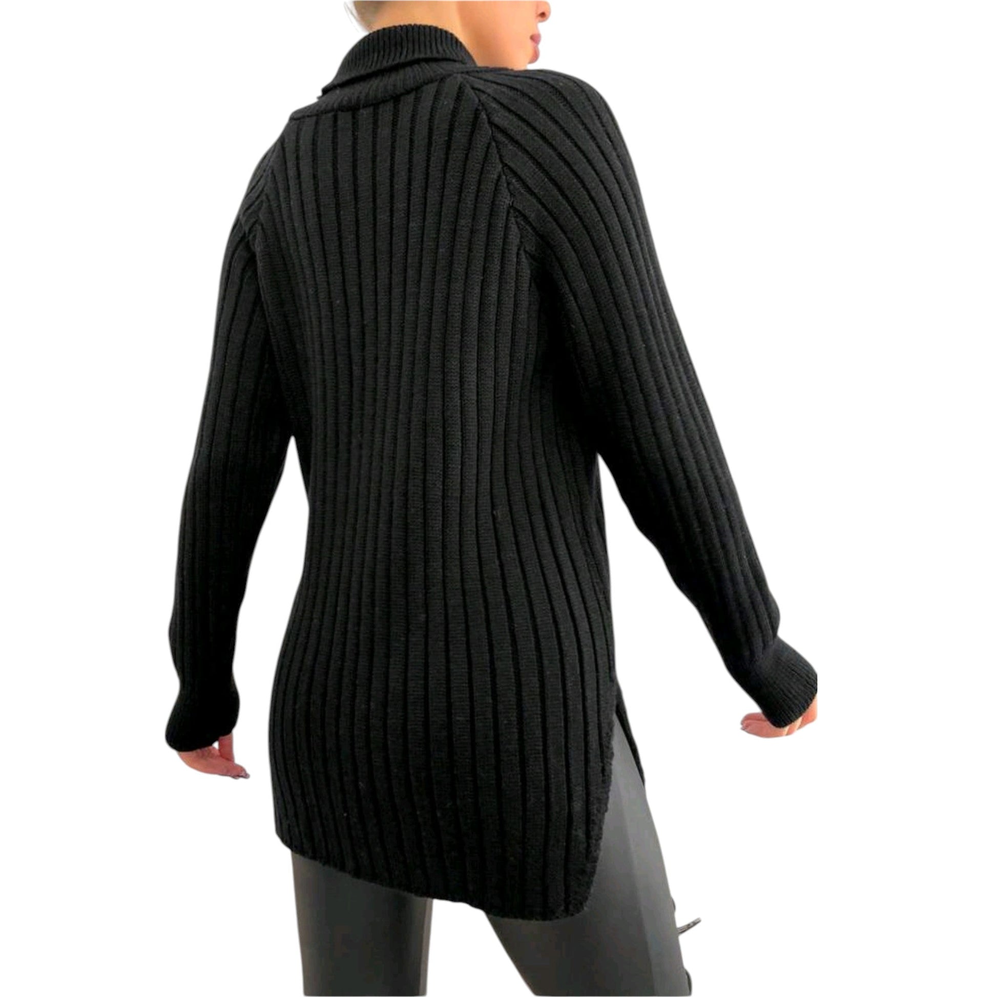 Címke nélküli, fekete, hosszú ujjú, garbó nyakú, bordázott kötésű, hosszított pulóver, oldalt sliccelt.