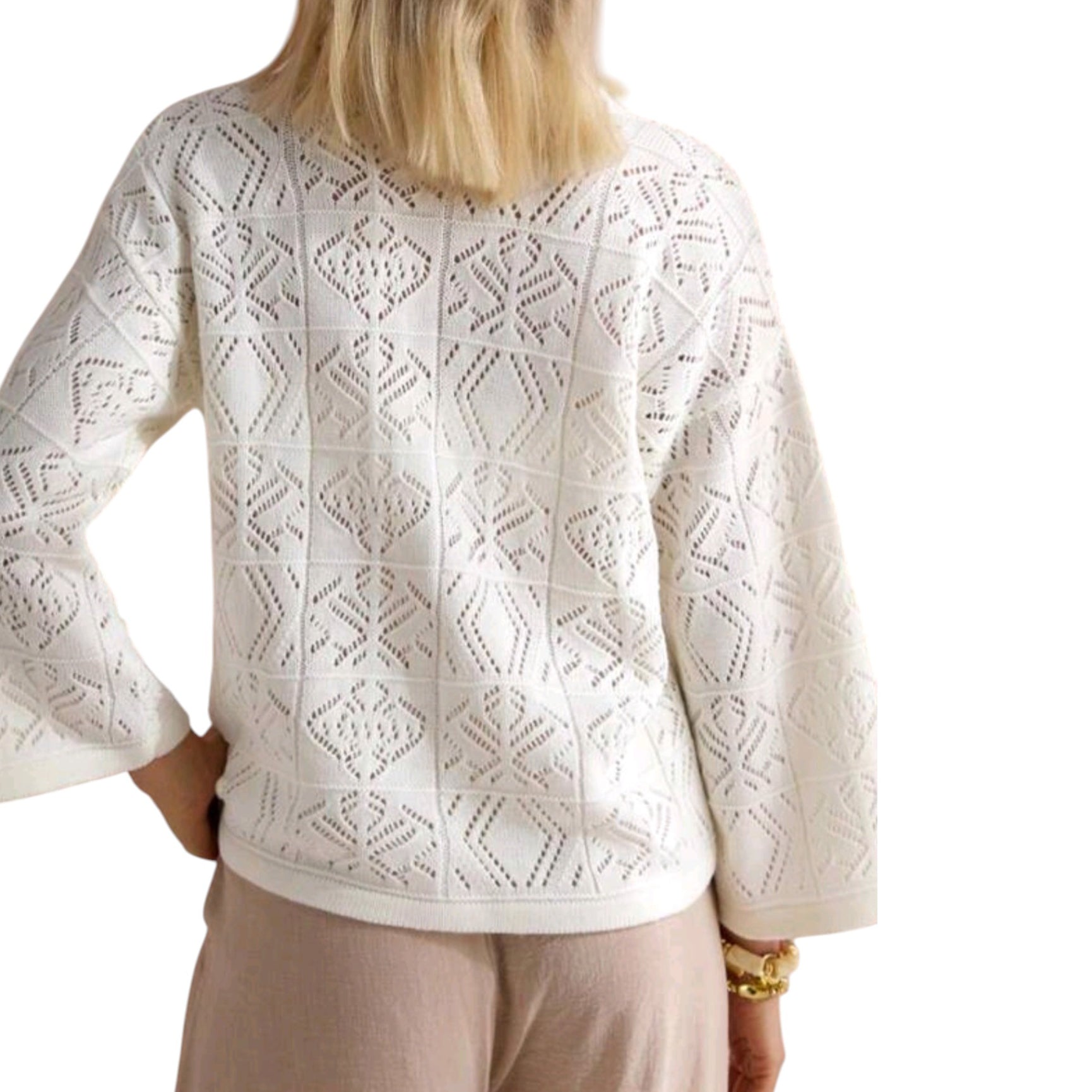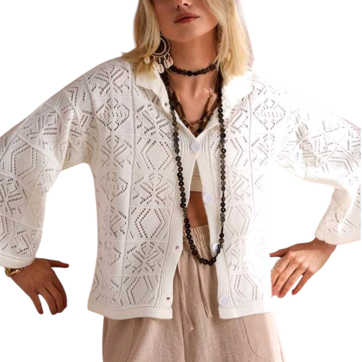 Címke nélküli, fehér, hosszú harangujjú, galléros, gombos, áttört mintás kötött kardigán.