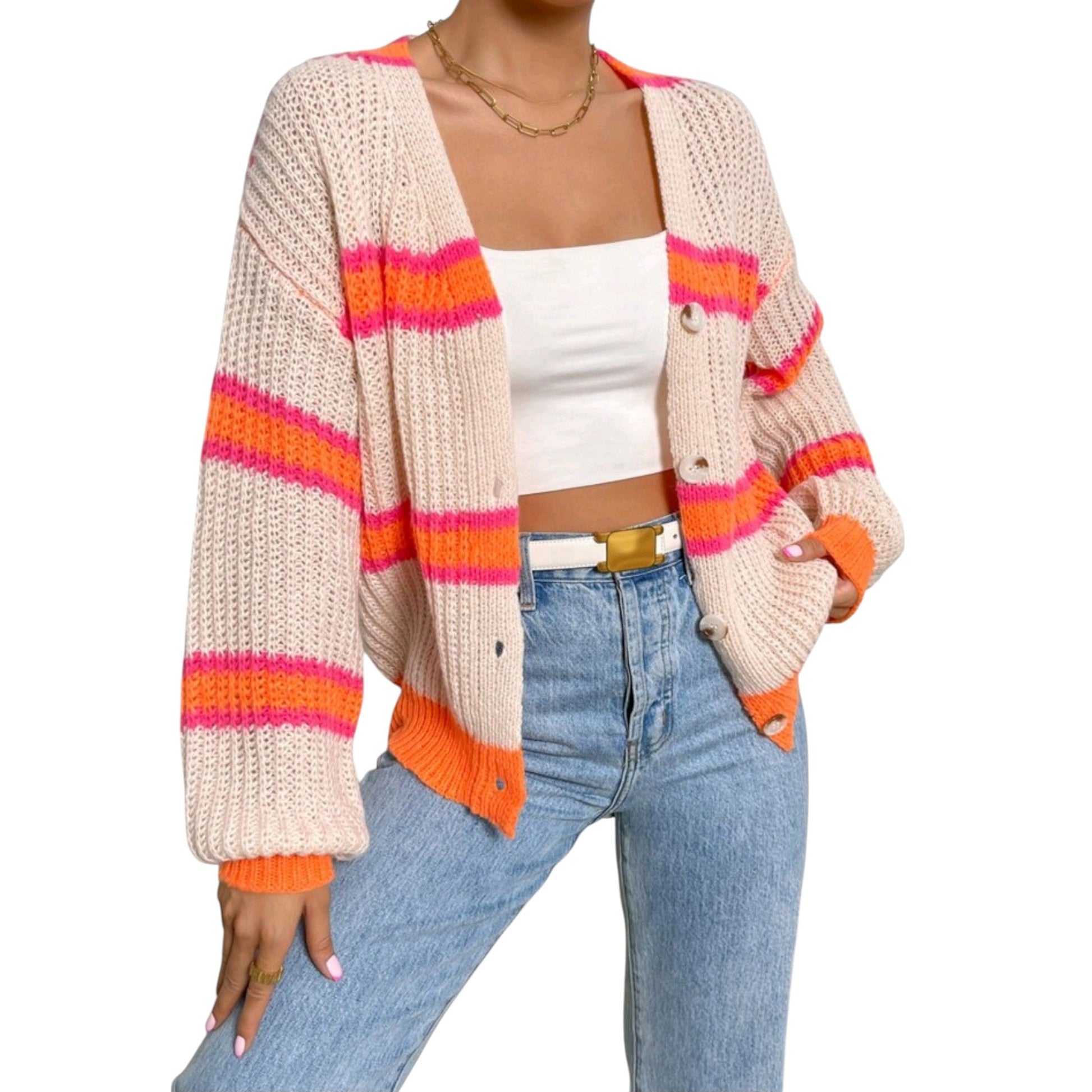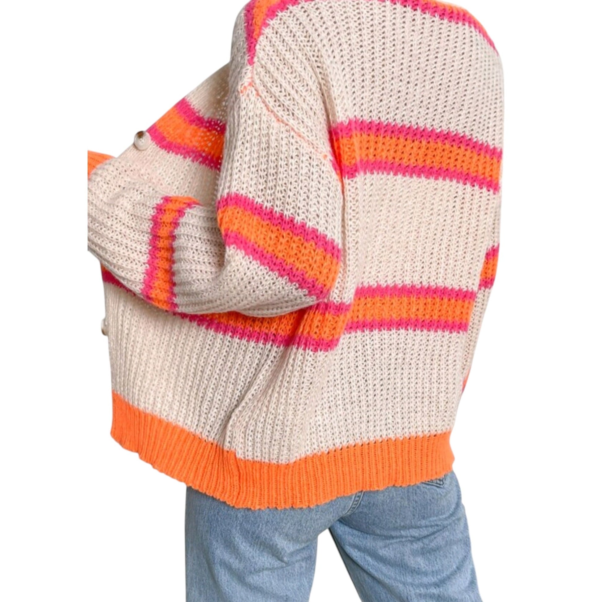Címke nélküli, bézs, narancssárga és rózsaszín csíkos, hosszú ujjú, V-nyakú, gombos, kötött kardigán.