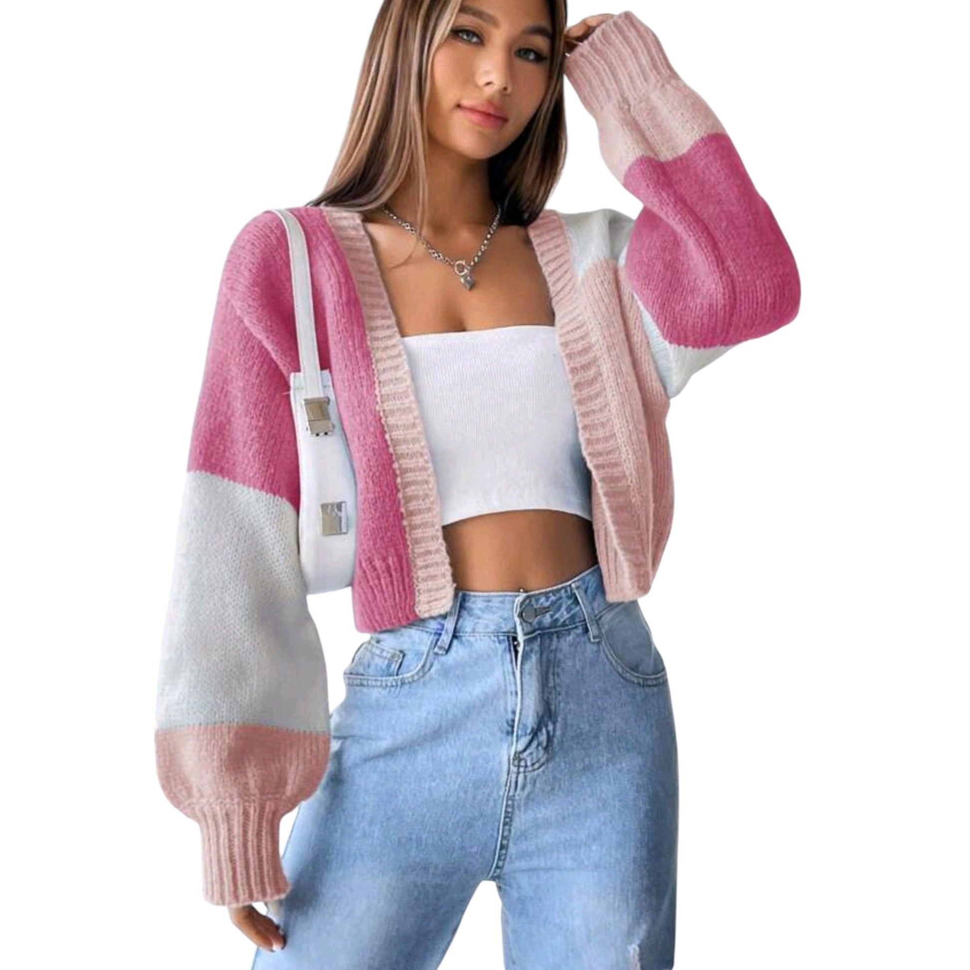 Címke nélküli, rózsaszín, halvány rózsaszín és fehér színblokkos, hosszú ujjú, nyitott elejű, kötött crop kardigán.