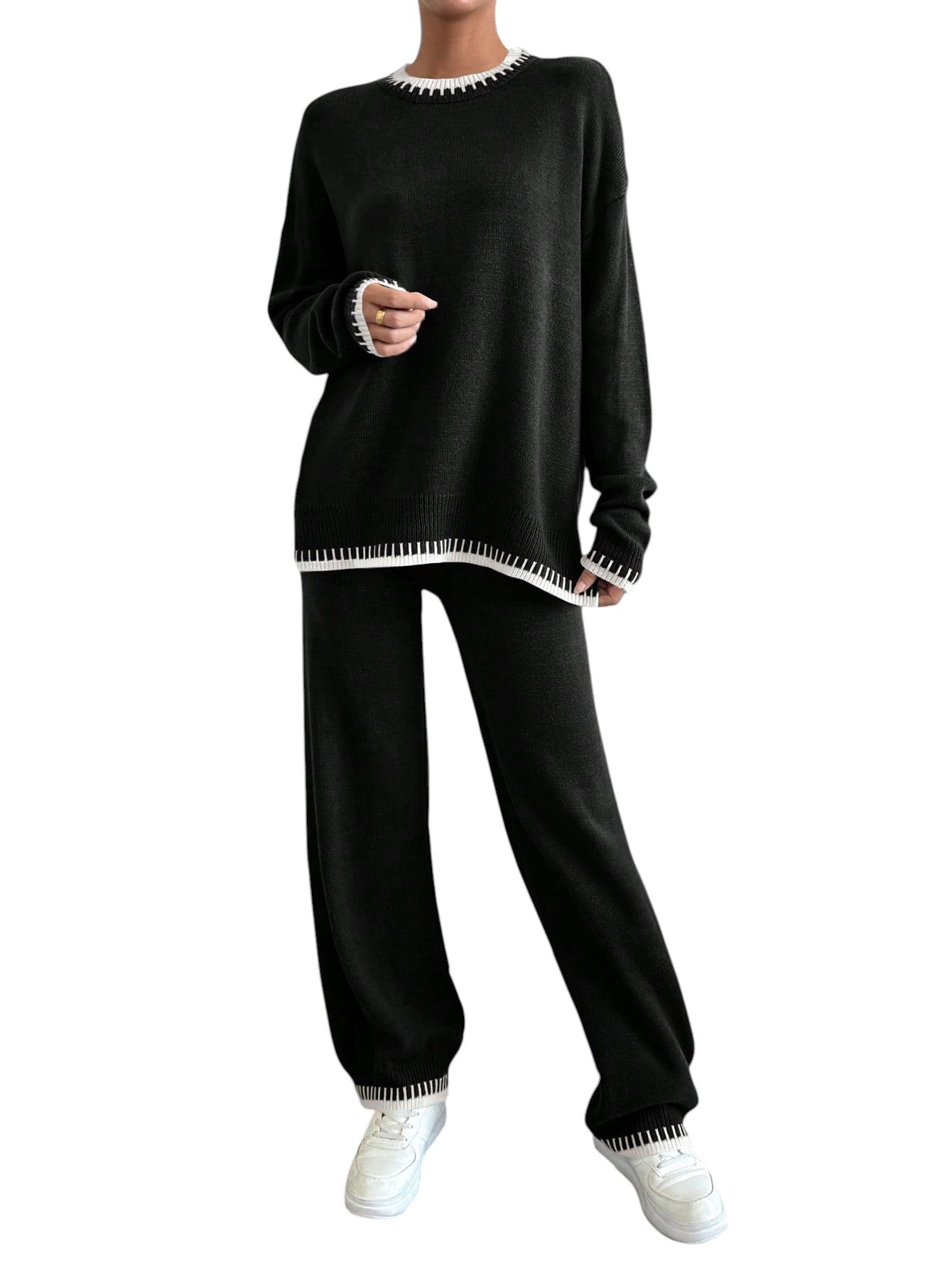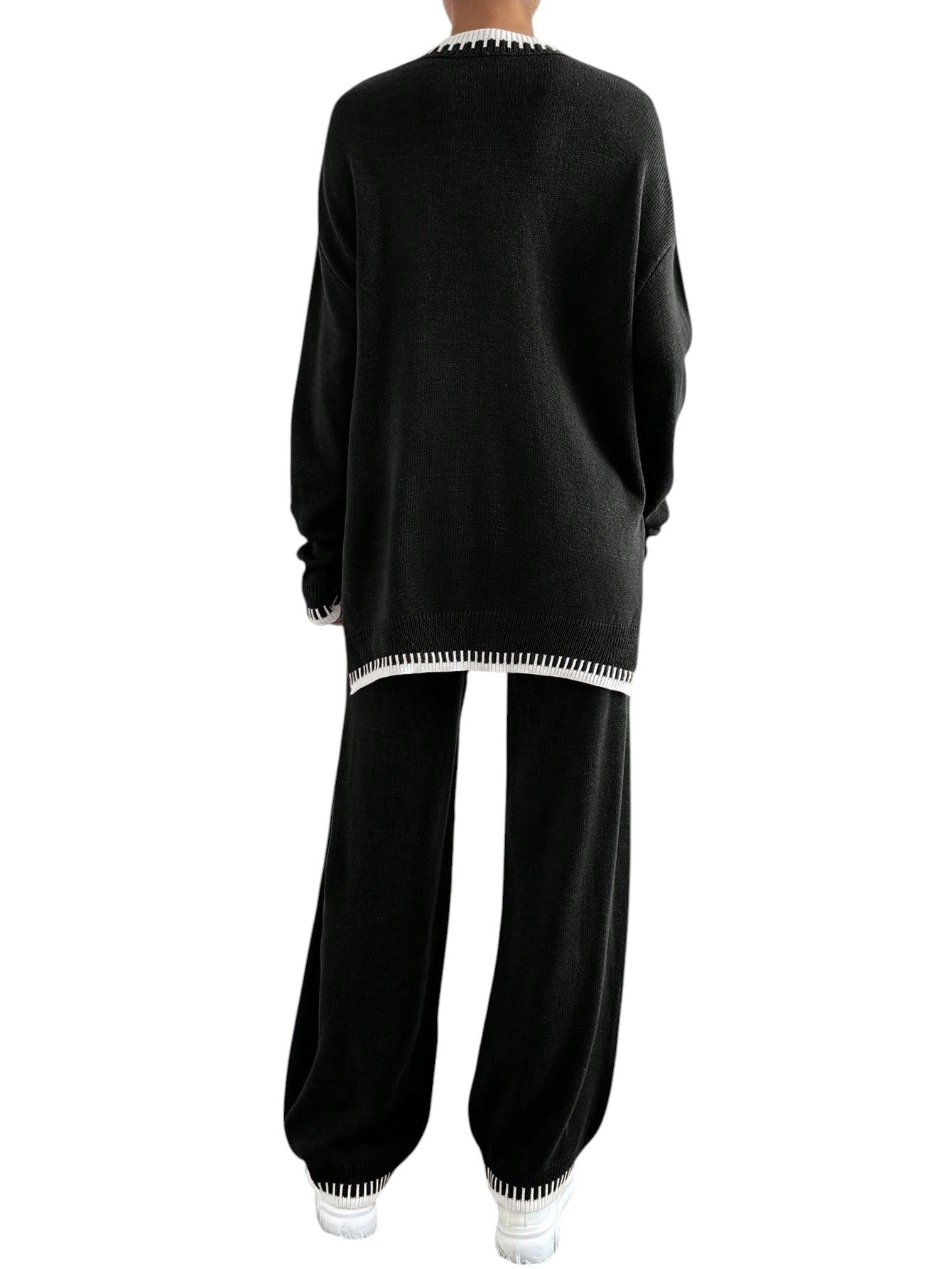 Címke nélküli, fekete alapon fehér szegélyes, hosszú ujjú kötött pulóver és bő szárú kötött nadrág szett
