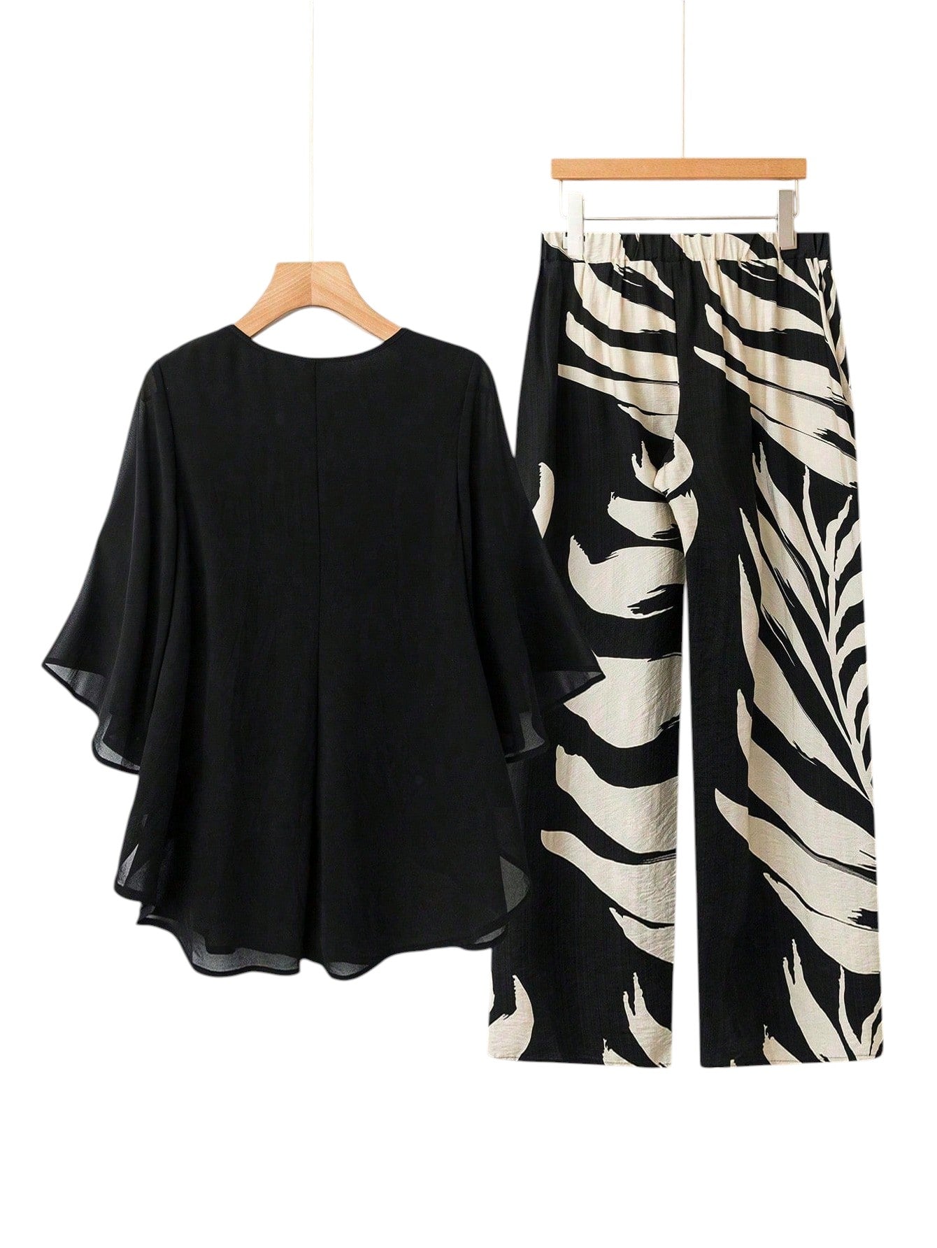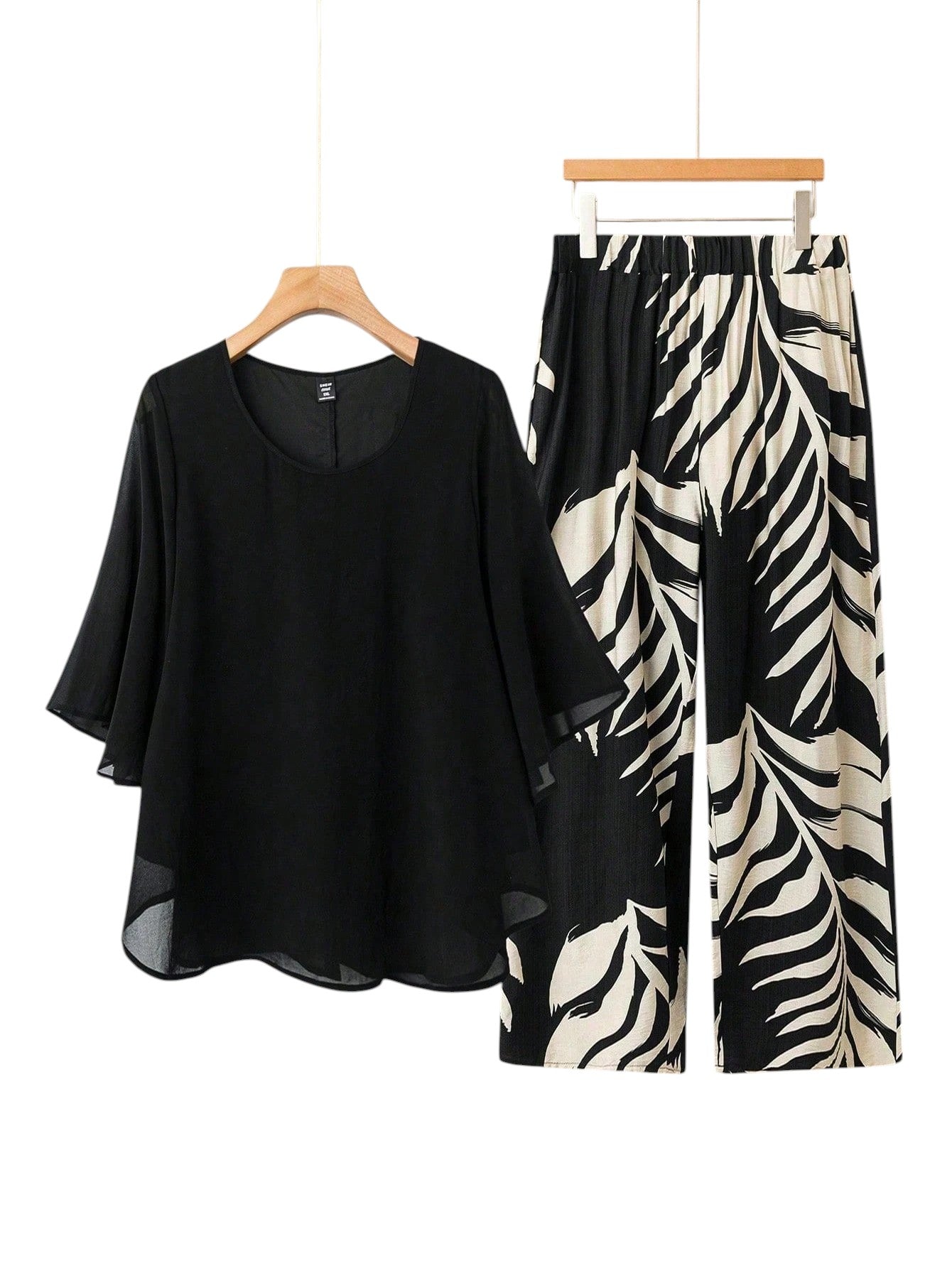 Címke nélküli, fekete alapon törtfehér levélmintás, rövid ujjú blúz és bő szárú nadrág szett