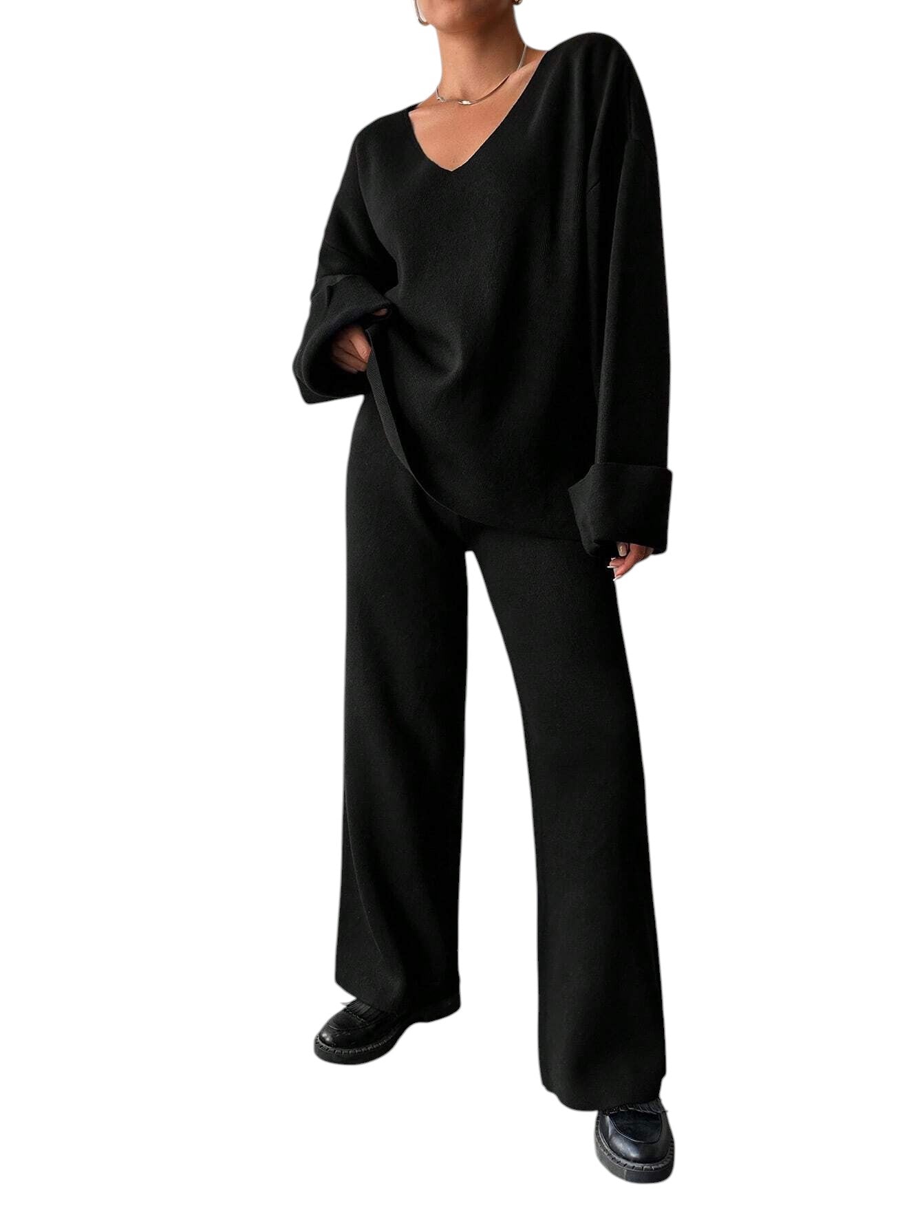 Címke nélküli, fekete, V-nyakú, hosszú ujjú kötött felső és hozzáillő bő szárú nadrág szett