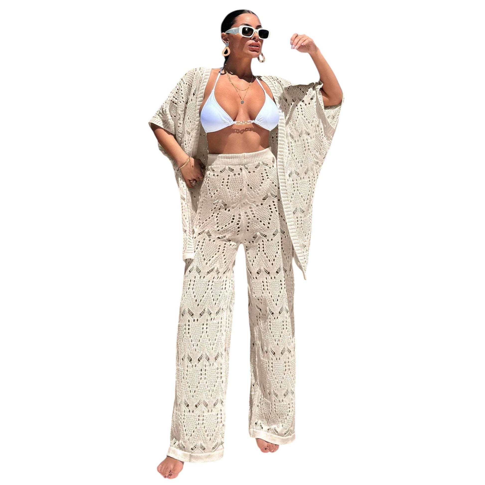 Címke nélküli, bézs, horgolt, széles szárú strandnadrág és kardigán