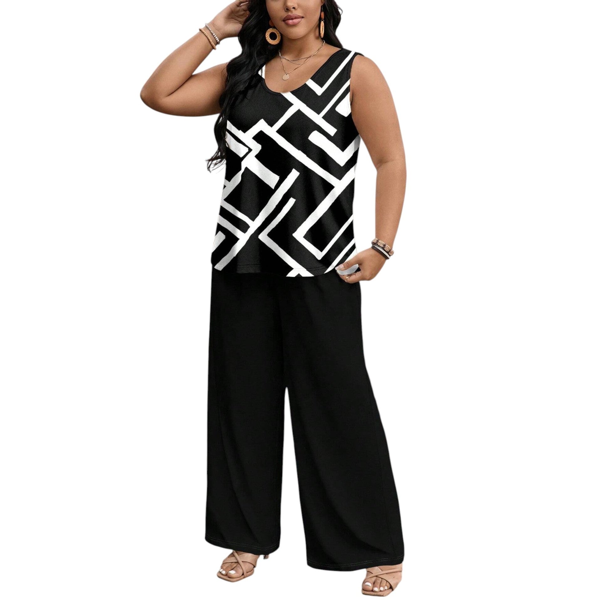 Címke nélküli, fekete-fehér geometrikus mintás ujjatlan top és fekete, bő szárú nadrág szett.