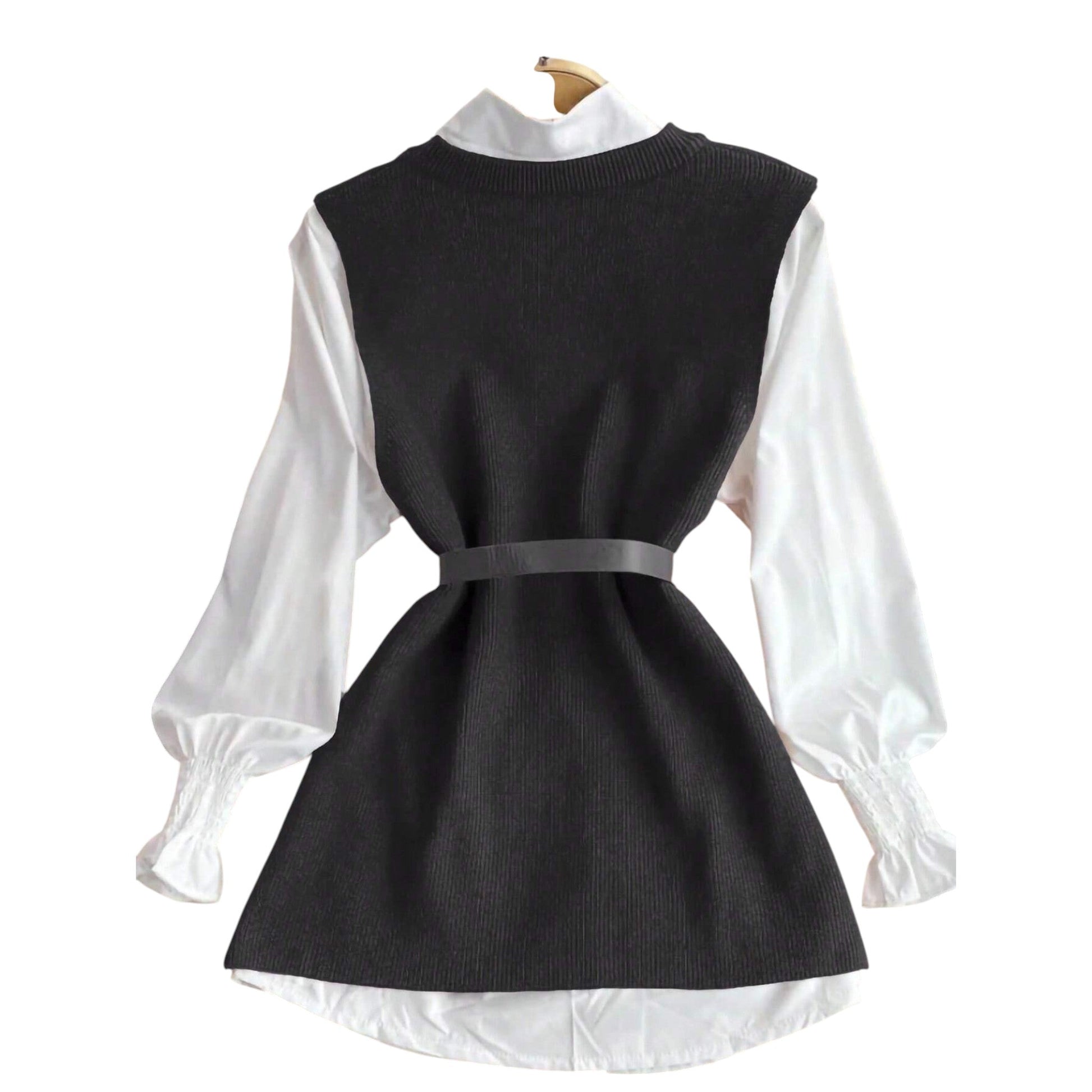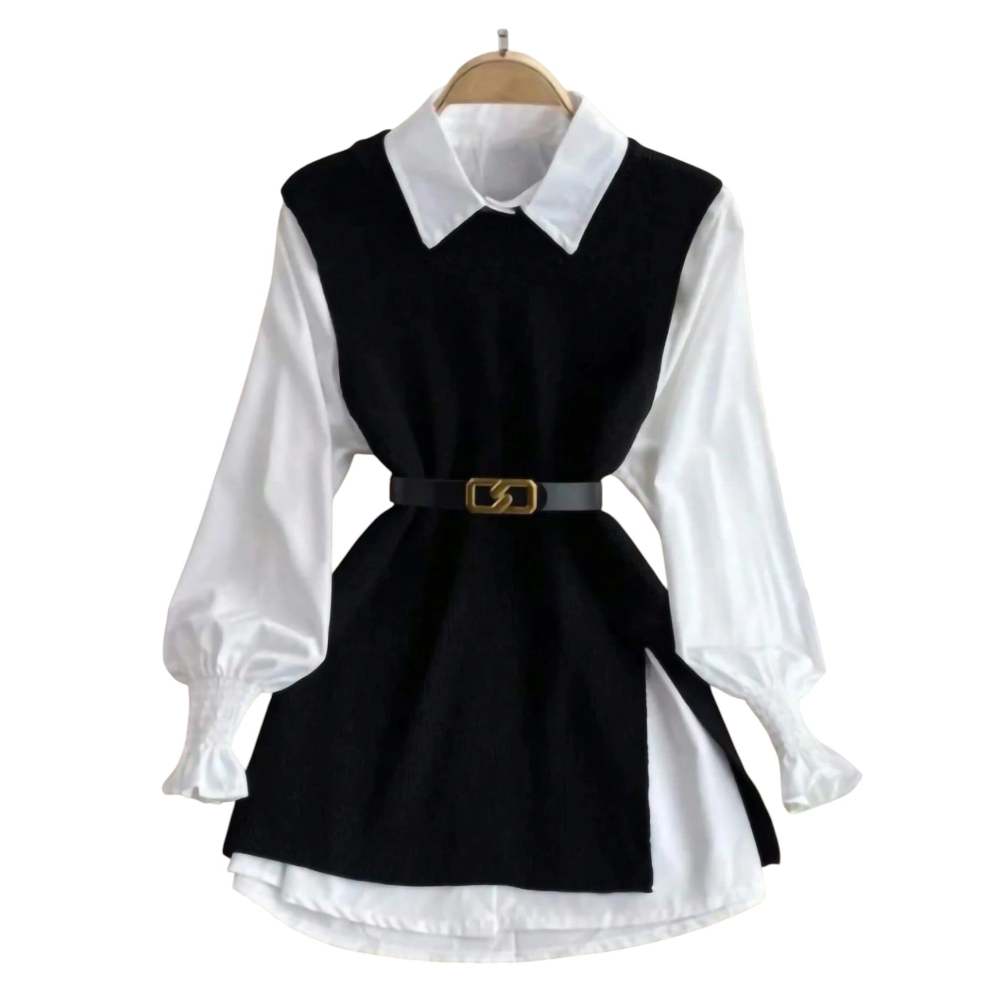 Címke nélküli, fekete és fehér, hosszú ujjú, galléros, övvel.