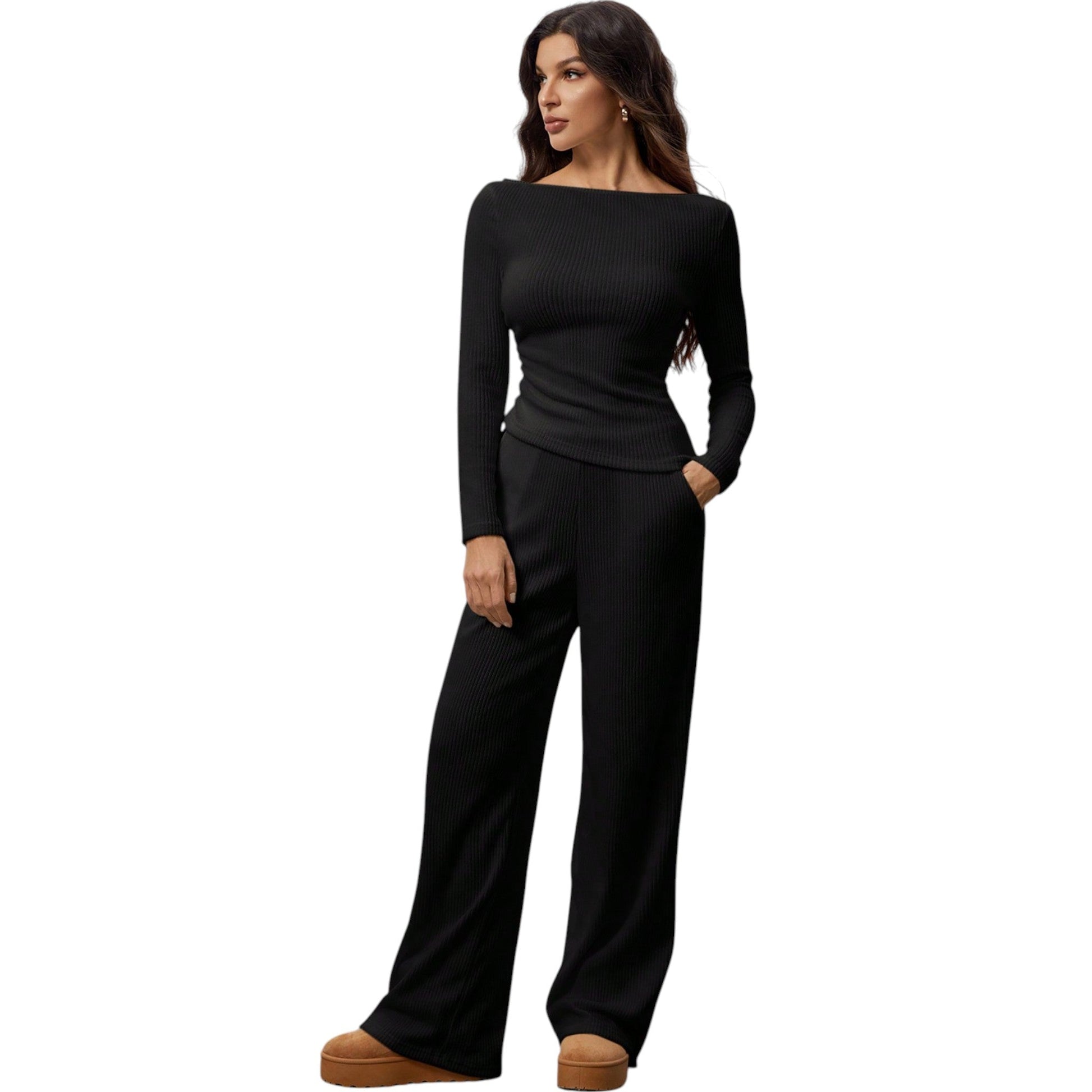 Címke nélküli, fekete, bordázott, kétrészes kötött szett, hosszú ujjú felsővel és bő szárú nadrággal.