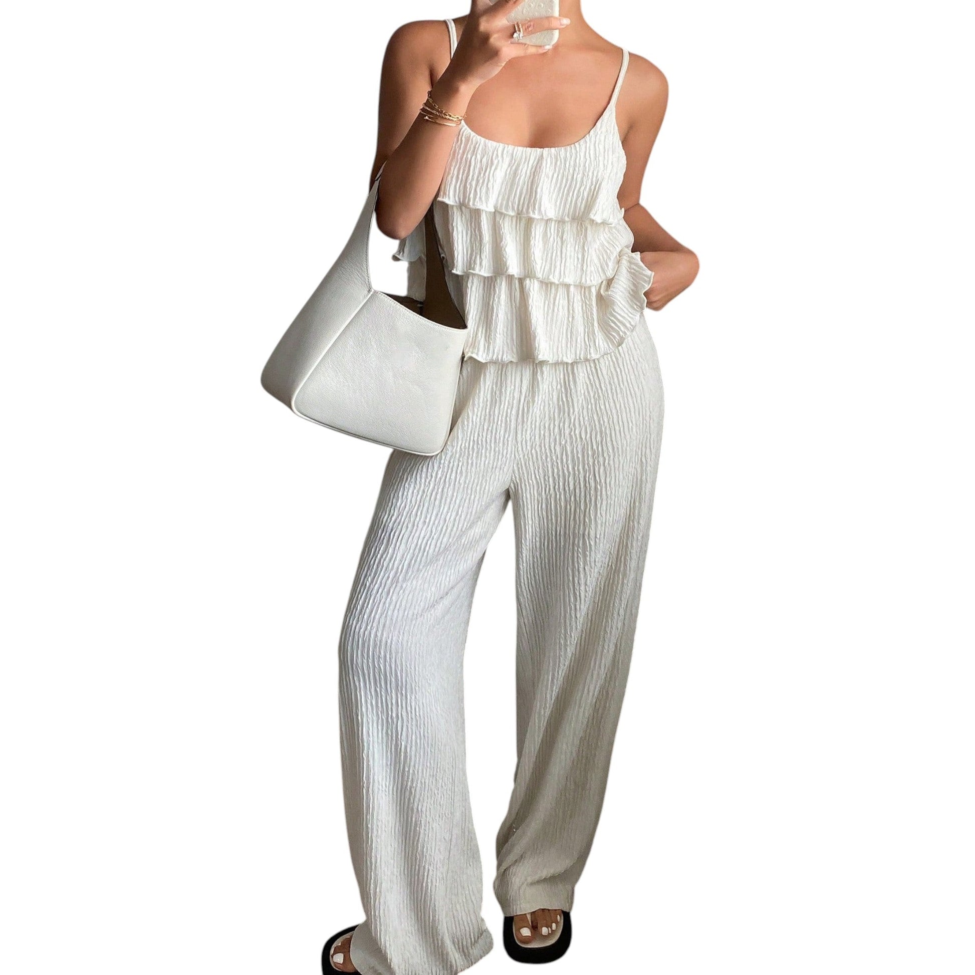 Címke nélküli, fehér, texturált anyagú, pántos, fodros felsővel és széles szárú nadrággal