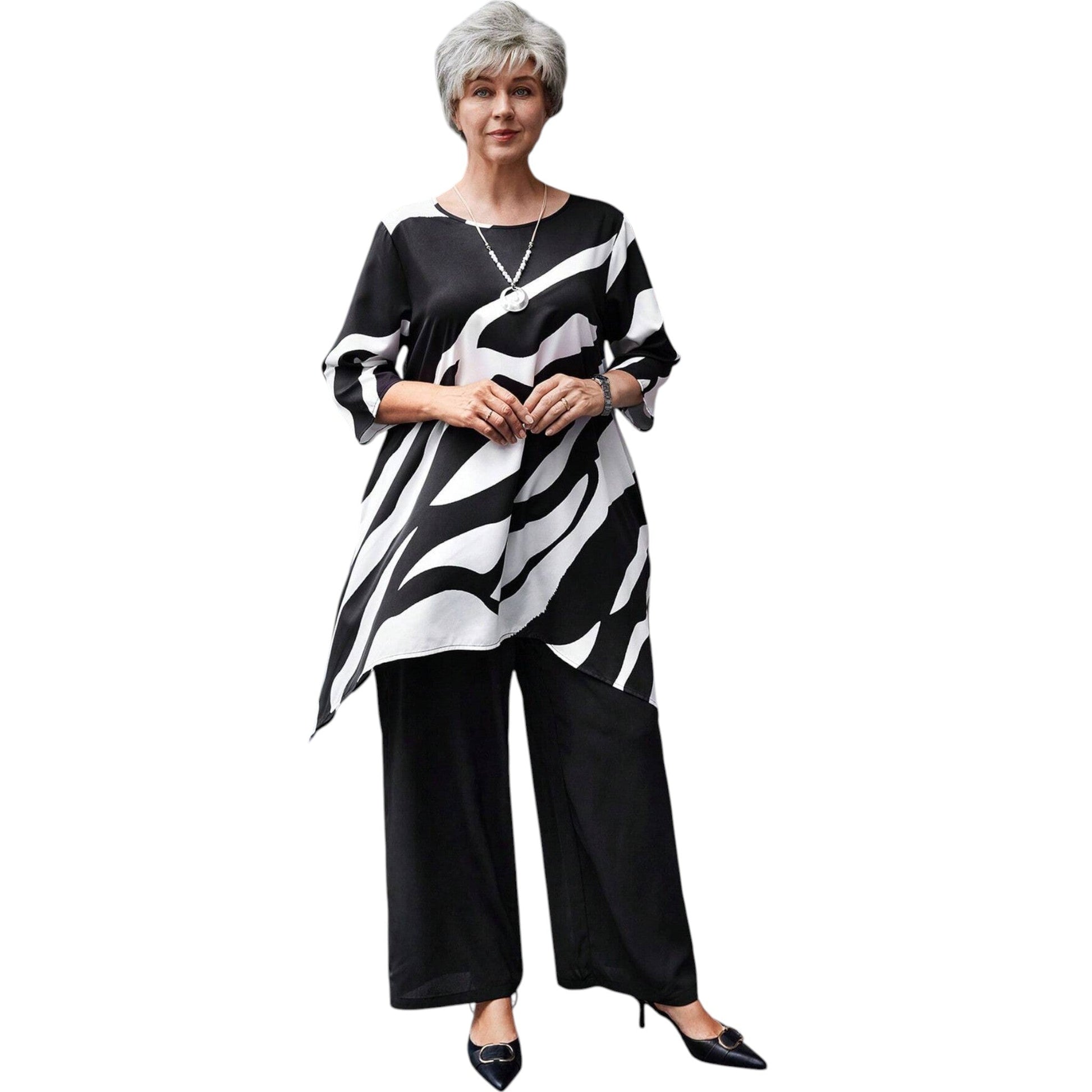 Címke nélküli, fekete-fehér, zebra mintás, kétrészes szett, aszimmetrikus tunikával és bő nadrággal.