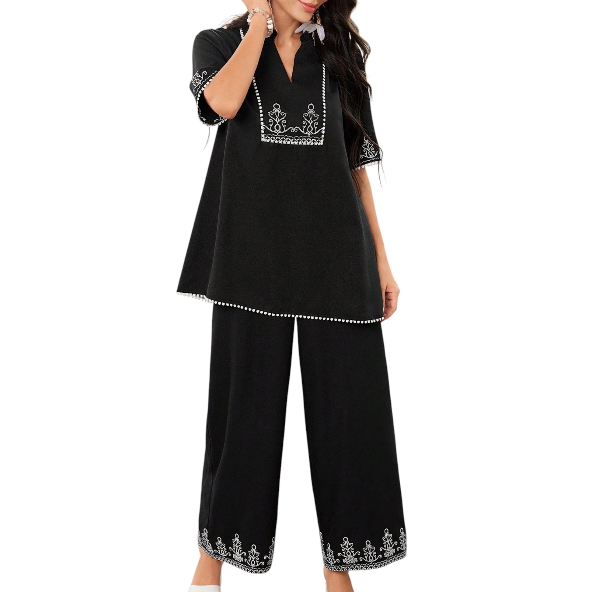 Címke nélküli, fekete, rövid ujjú, V-nyakú, hímzett felső és hozzáillő hímzett, bő szárú nadrág