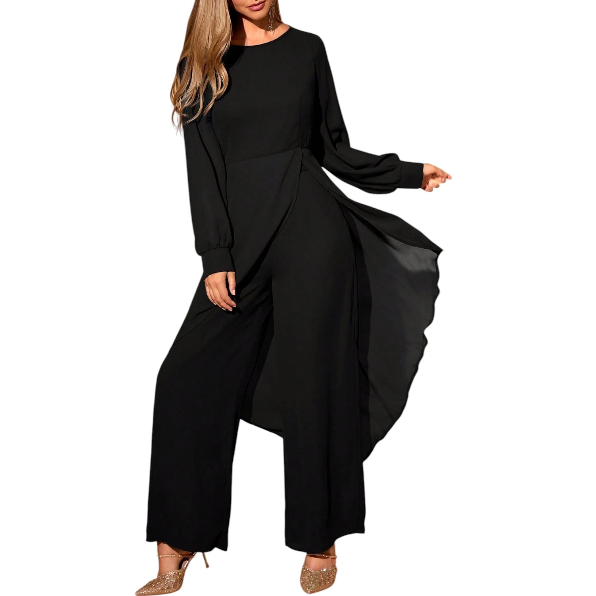 Címke nélküli, fekete, hosszú ujjú, környakú felső aszimmetrikus szoknya rátéttel, bő nadrággal.