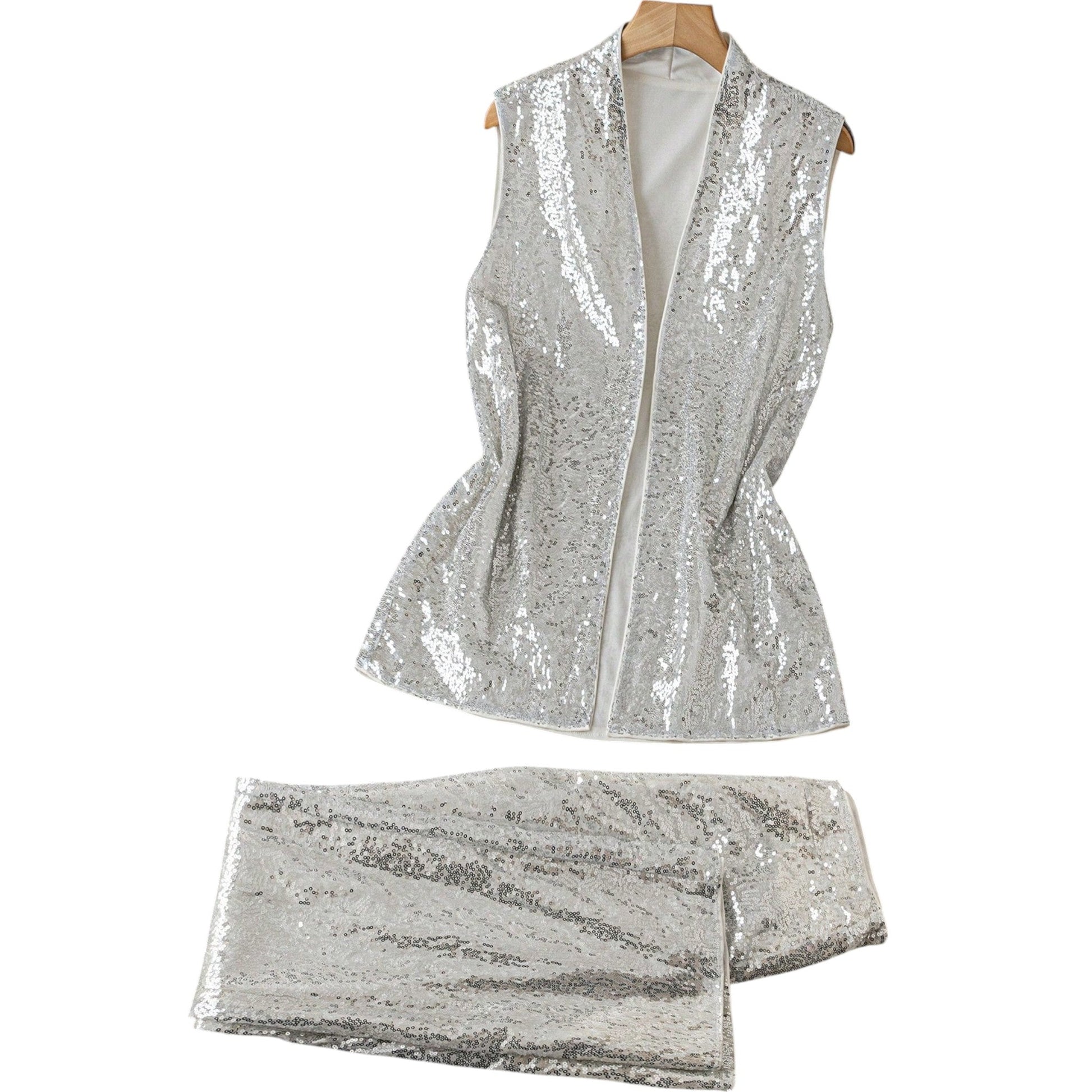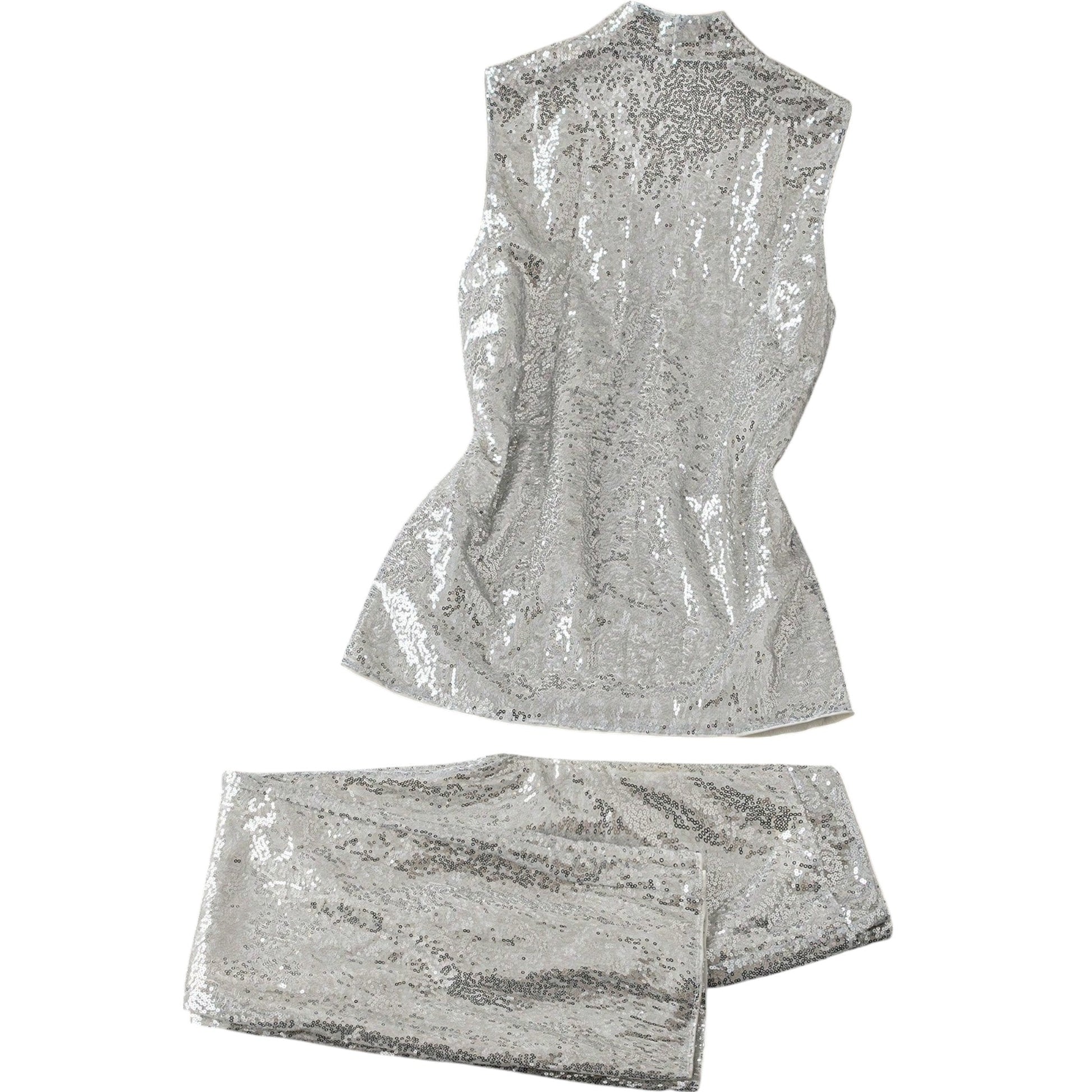 Címke nélküli, ezüst, flitteres, ujjatlan mellény és nadrág.