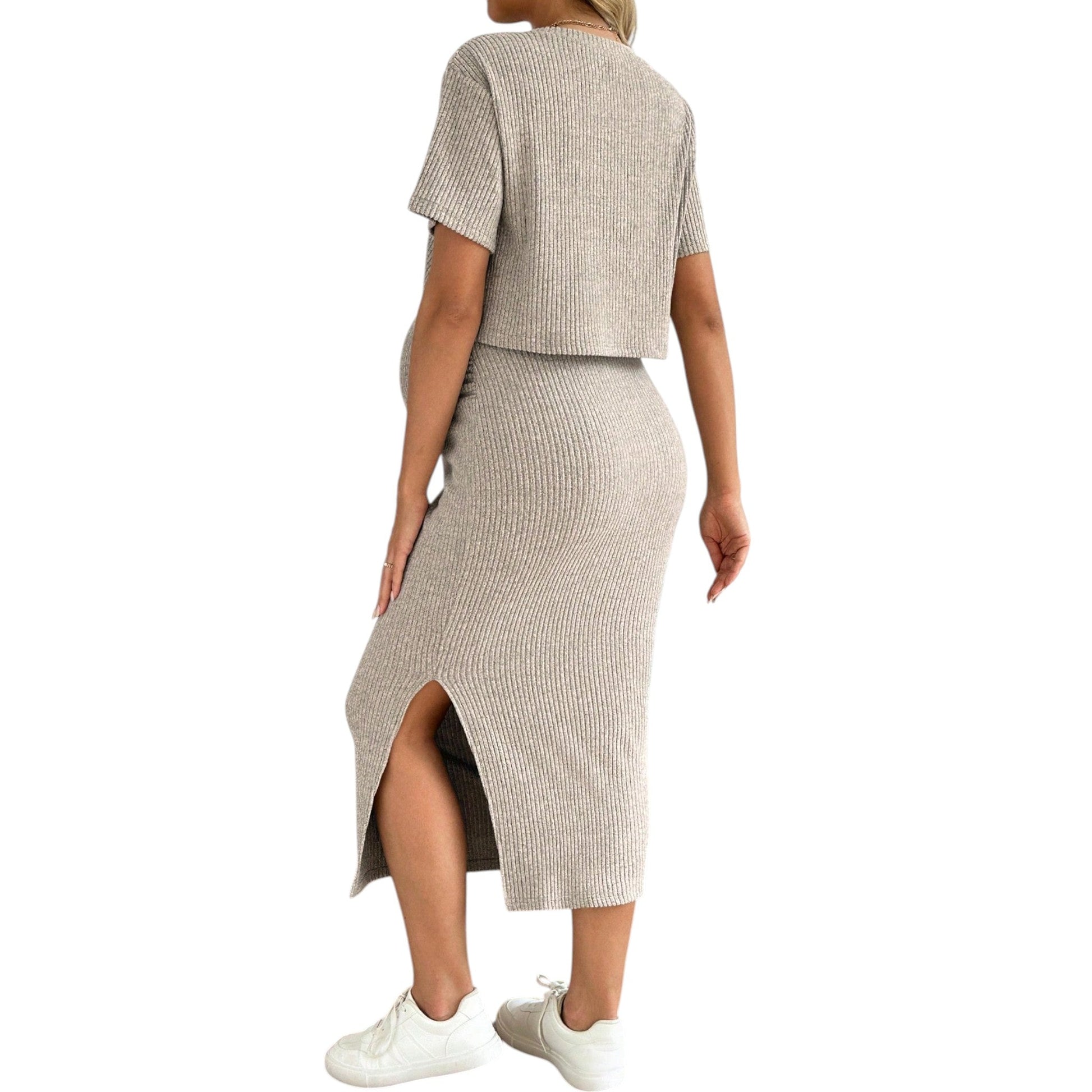 Címke nélküli, bézs, bordázott, rövid ujjú felsőből és oldalt sliccelt midi szoknyából álló szett.