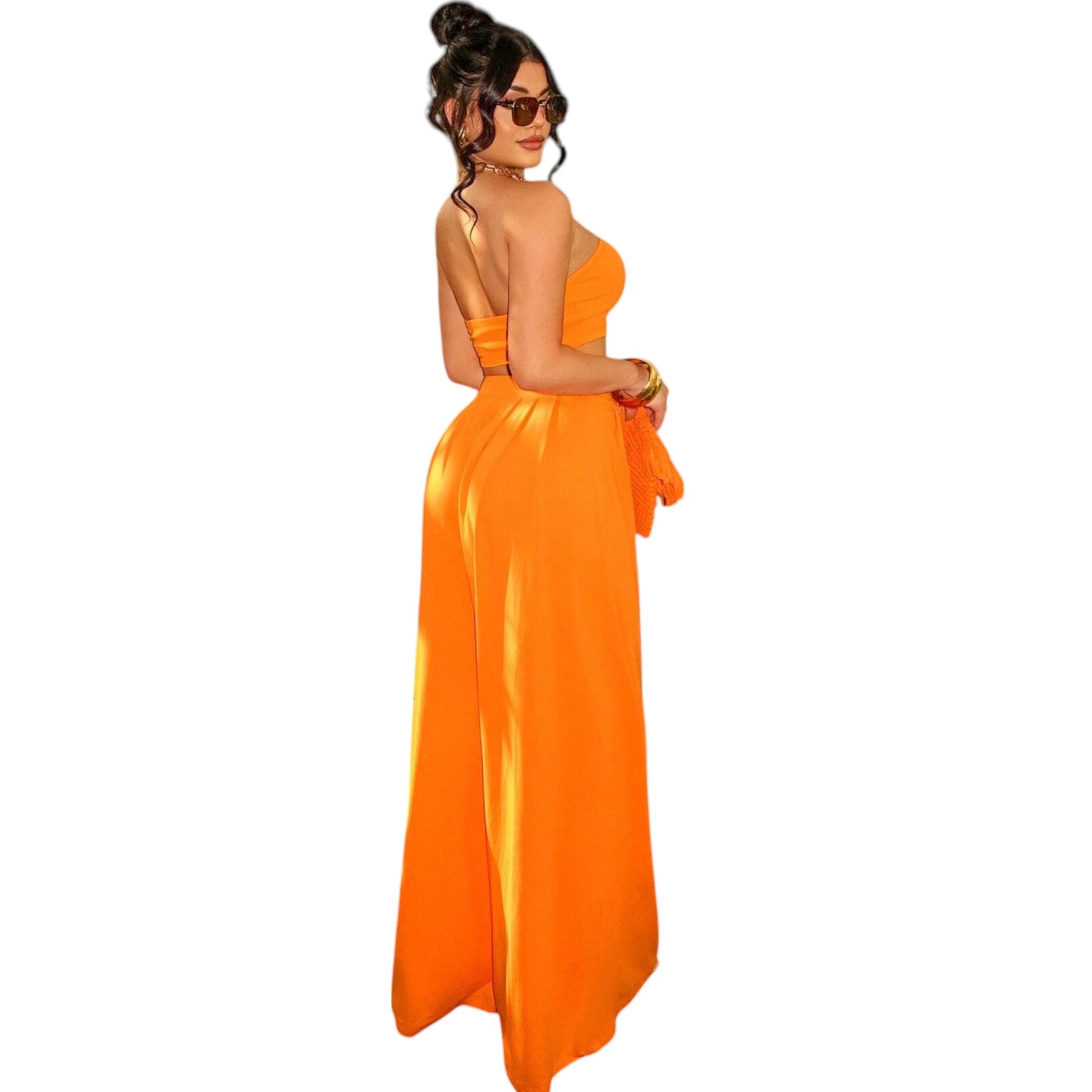 Címke nélküli, narancssárga, bandeau top és magas derekú, széles szárú nadrág szett.
