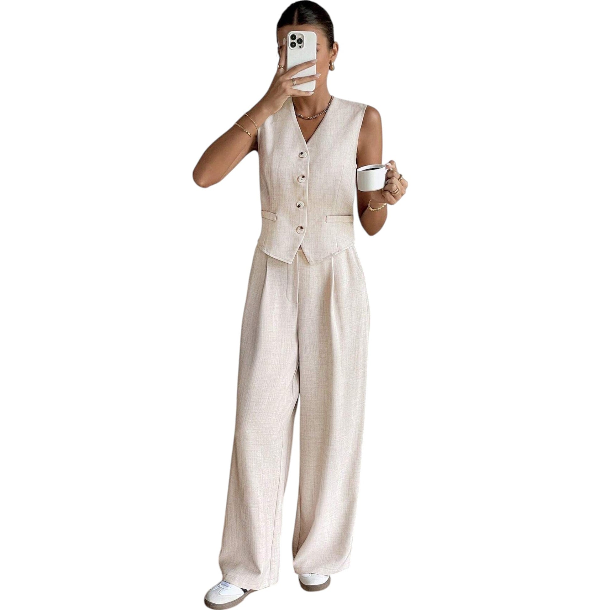 Címke nélküli, bézs, ujjatlan, V-nyakú, gombos mellény és bő szárú nadrág szett.