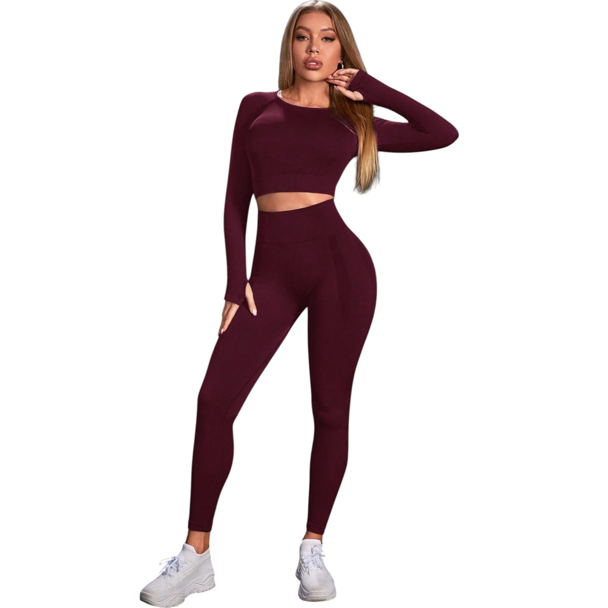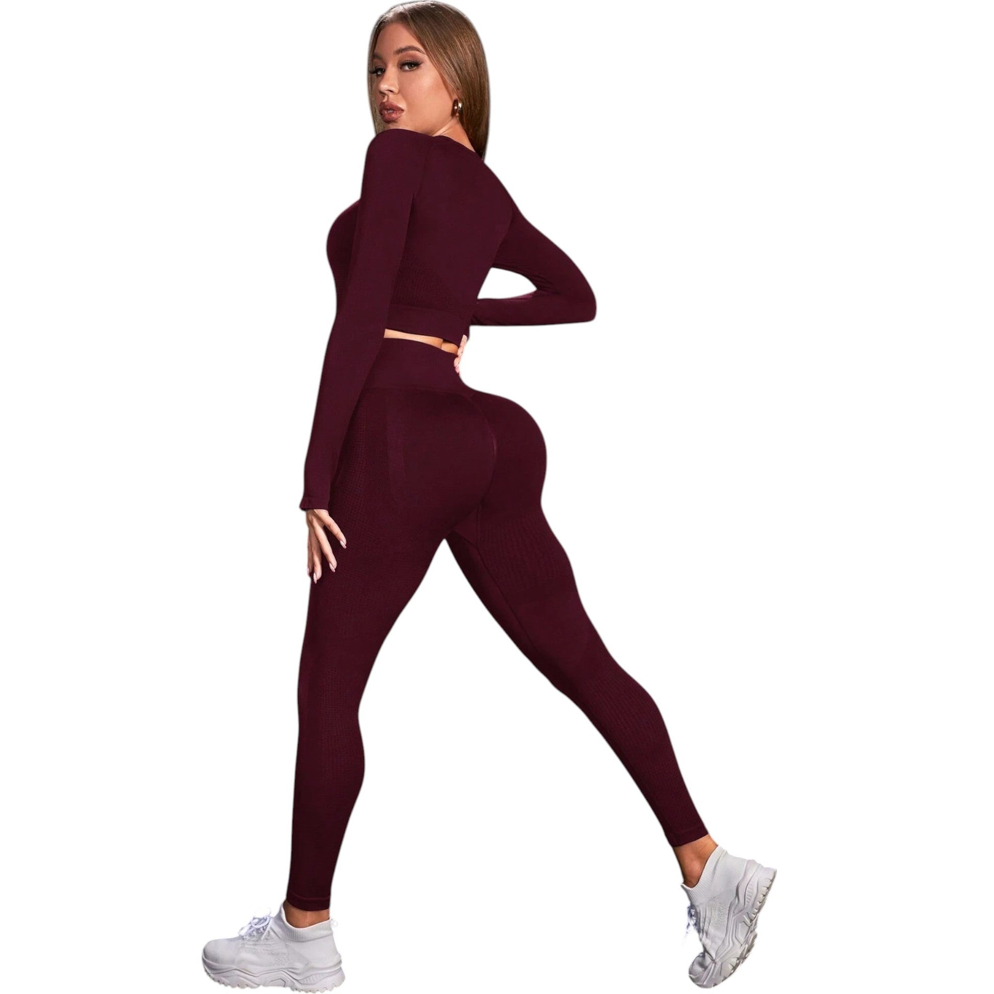 Címke nélküli, bordó színű, hosszú ujjú, crop top és magas derekú leggings szett, kivágásokkal.