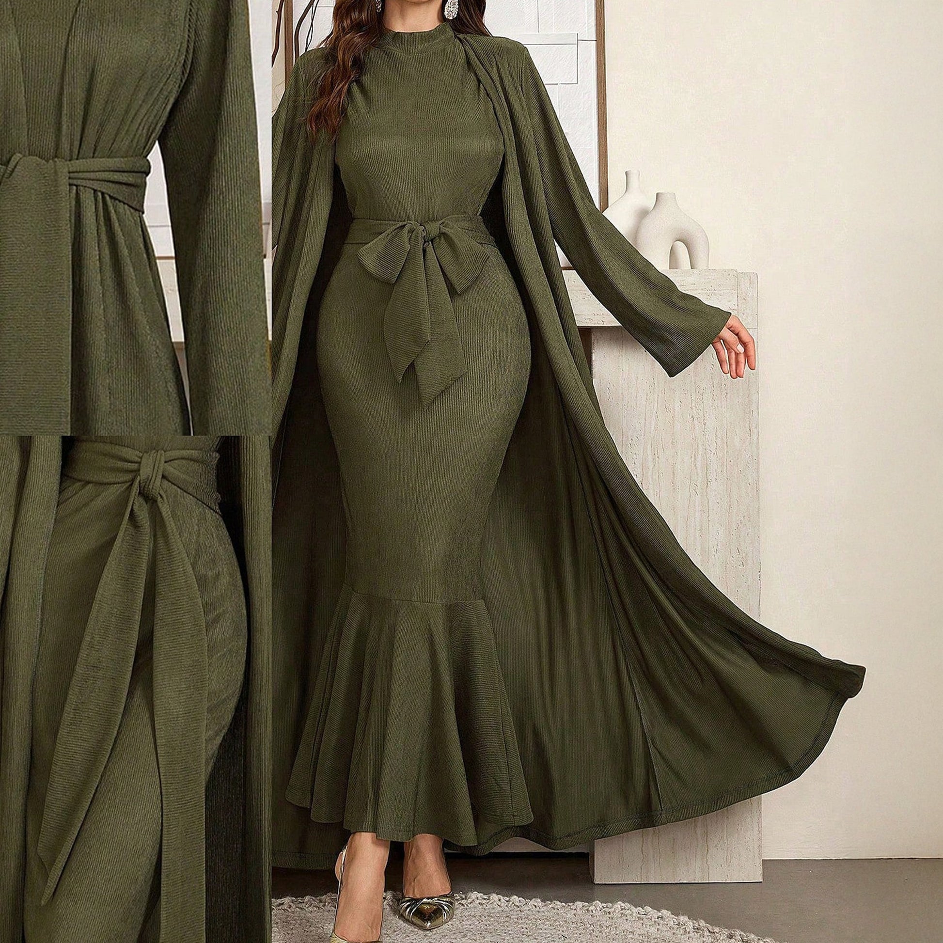 Címke nélküli, khaki, bordázott anyagú, hosszú ujjú, garbós, sellő fazonú maxiruha, övvel, és hozzá illő hosszú kardigán.