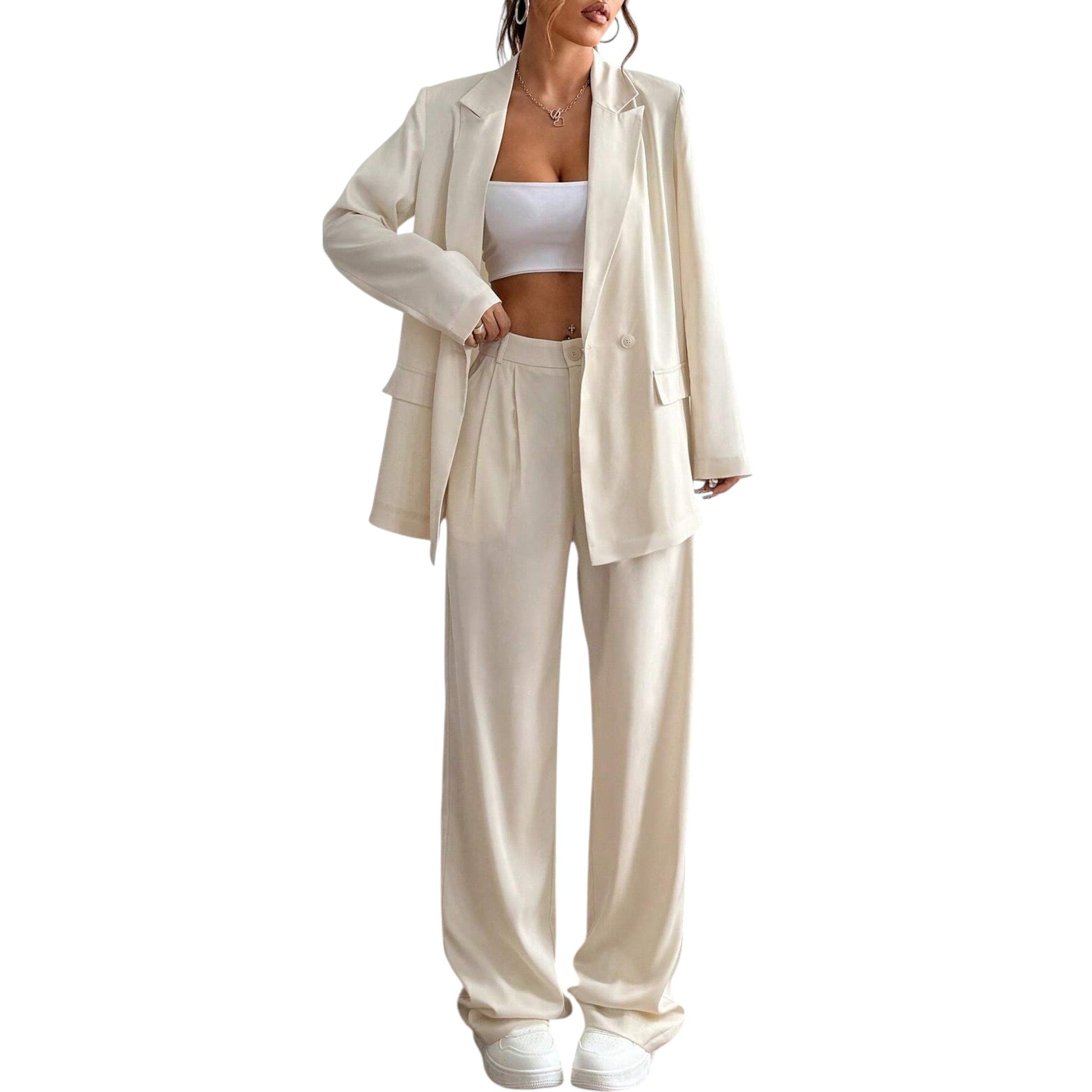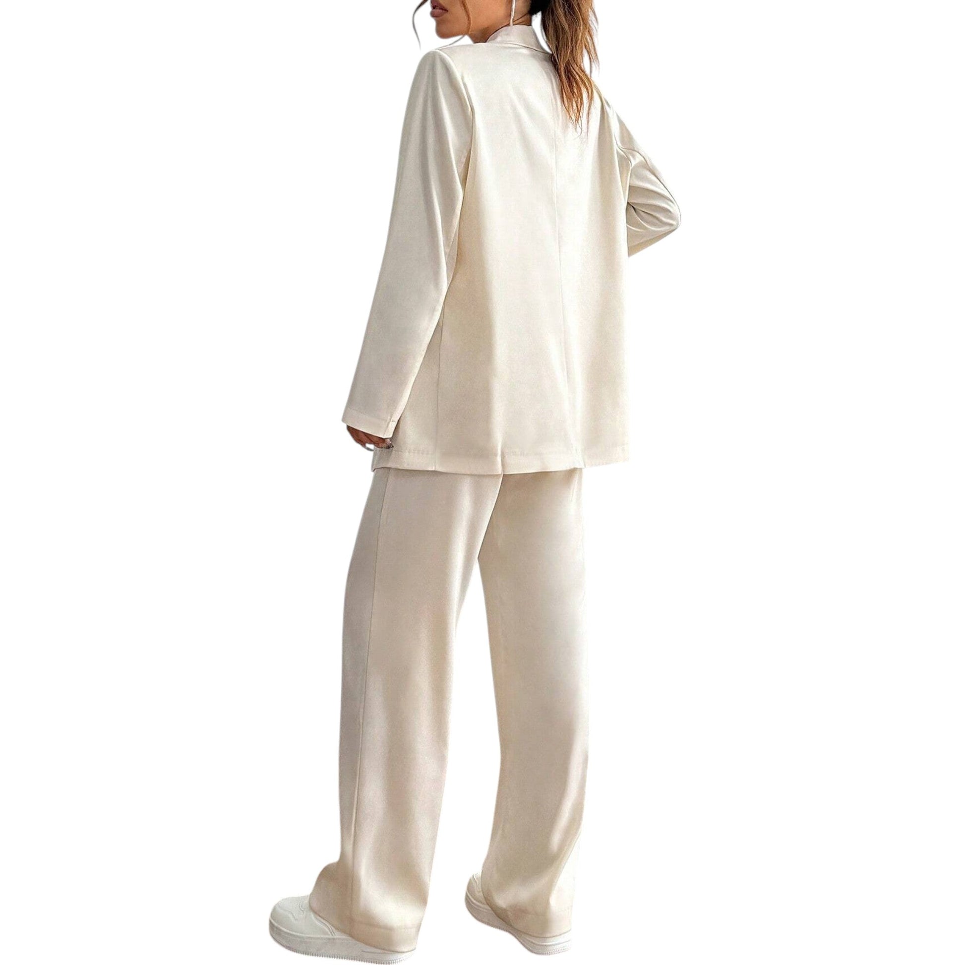 Címke nélküli, ekrü, kétrészes kosztüm, túlméretezett blézerrel és bő szárú nadrággal. A blézer hajtókás gallérral, két gombbal és zsebekkel. A nadrág magas derekú, pliszírozott.