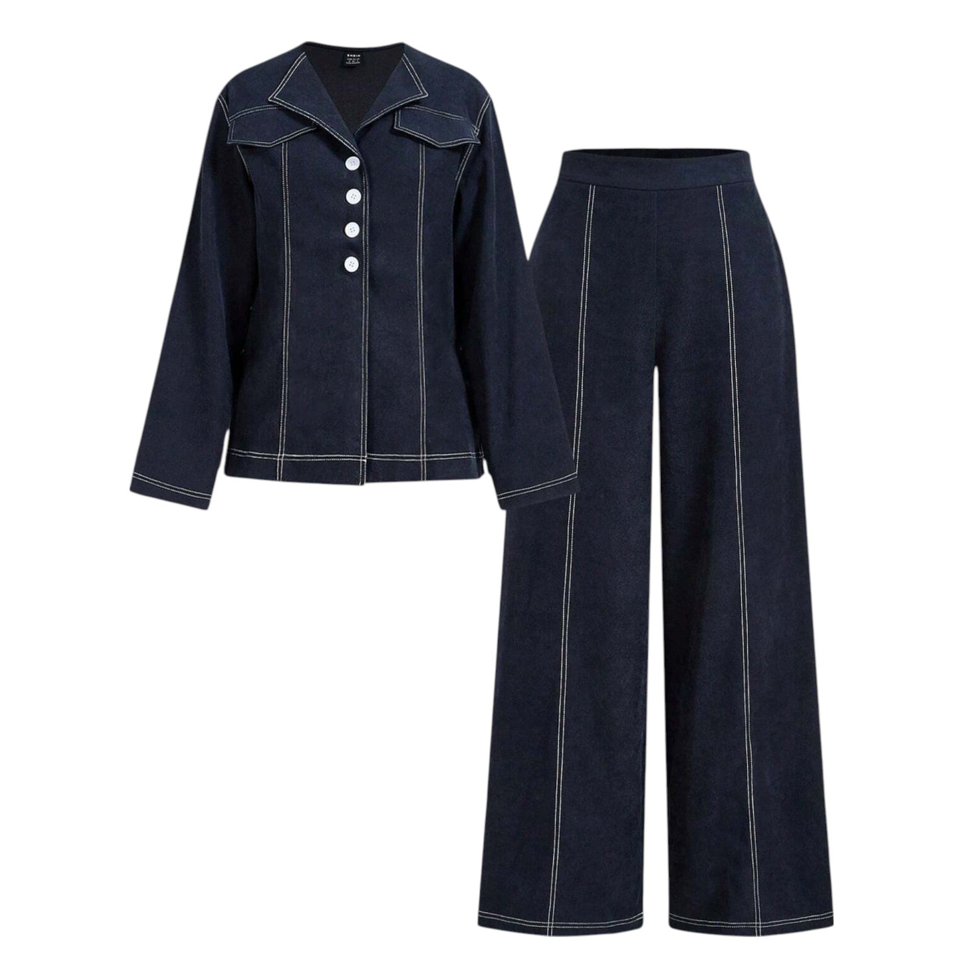 Címke nélküli, sötétkék, fehér varrással, ingkabát és széles szárú nadrág szett, gombos záródású ingkabát.