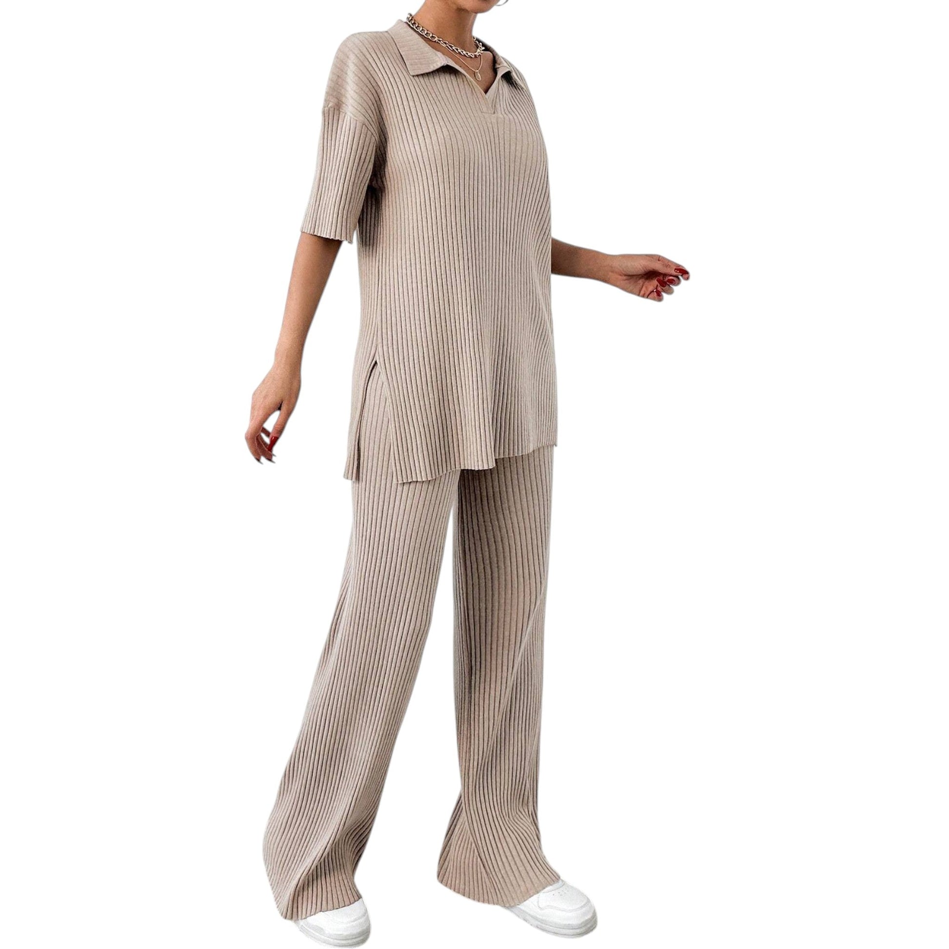 Címke nélküli, bézs színű, kötött, galléros rövid ujjú felső és hozzáillő bő szárú nadrág szett.