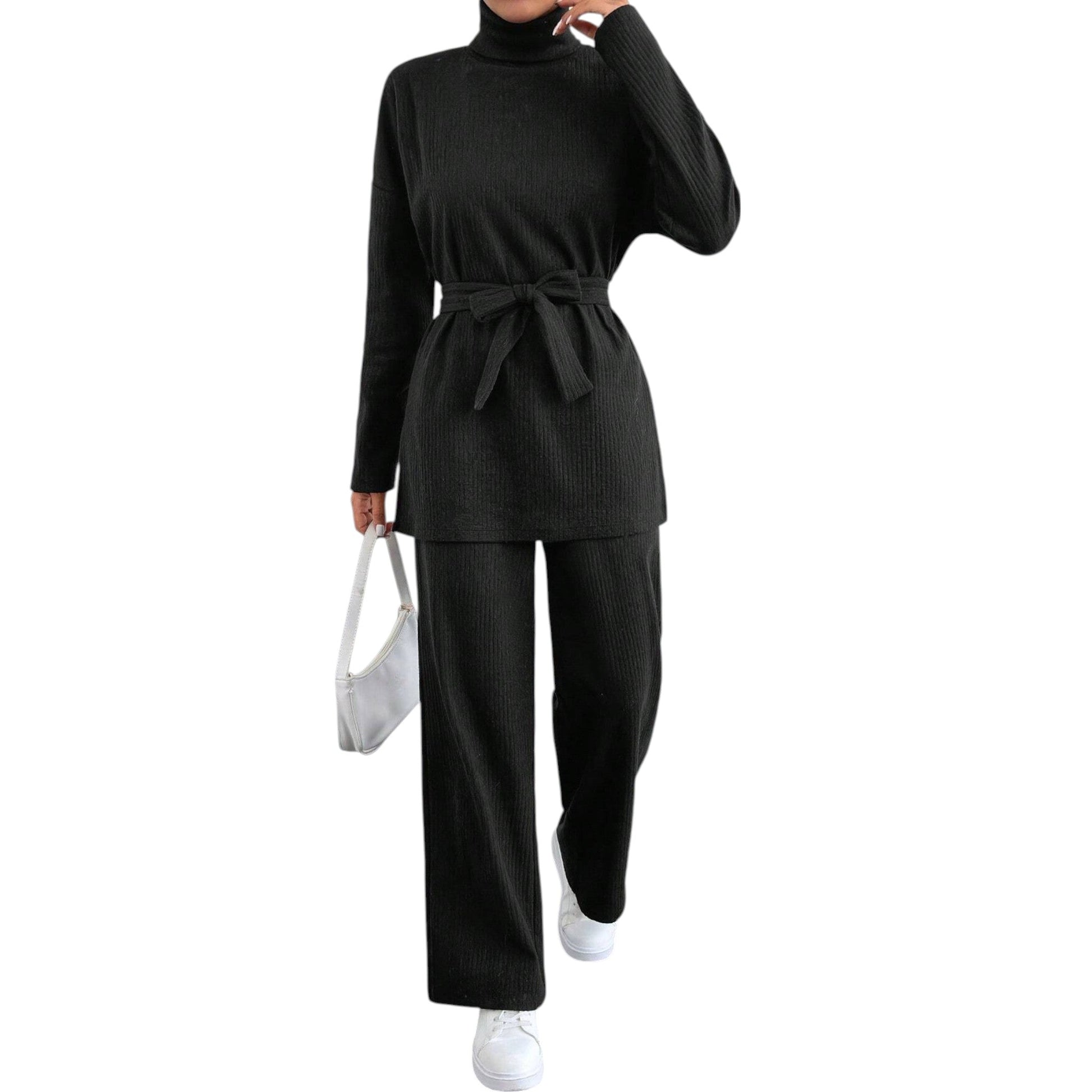 Címke nélküli, fekete, bordás kötött anyagból készült, hosszú ujjú, garbós felső és bő szárú nadrág szett, a felsőhöz tartozó megkötős övvel.