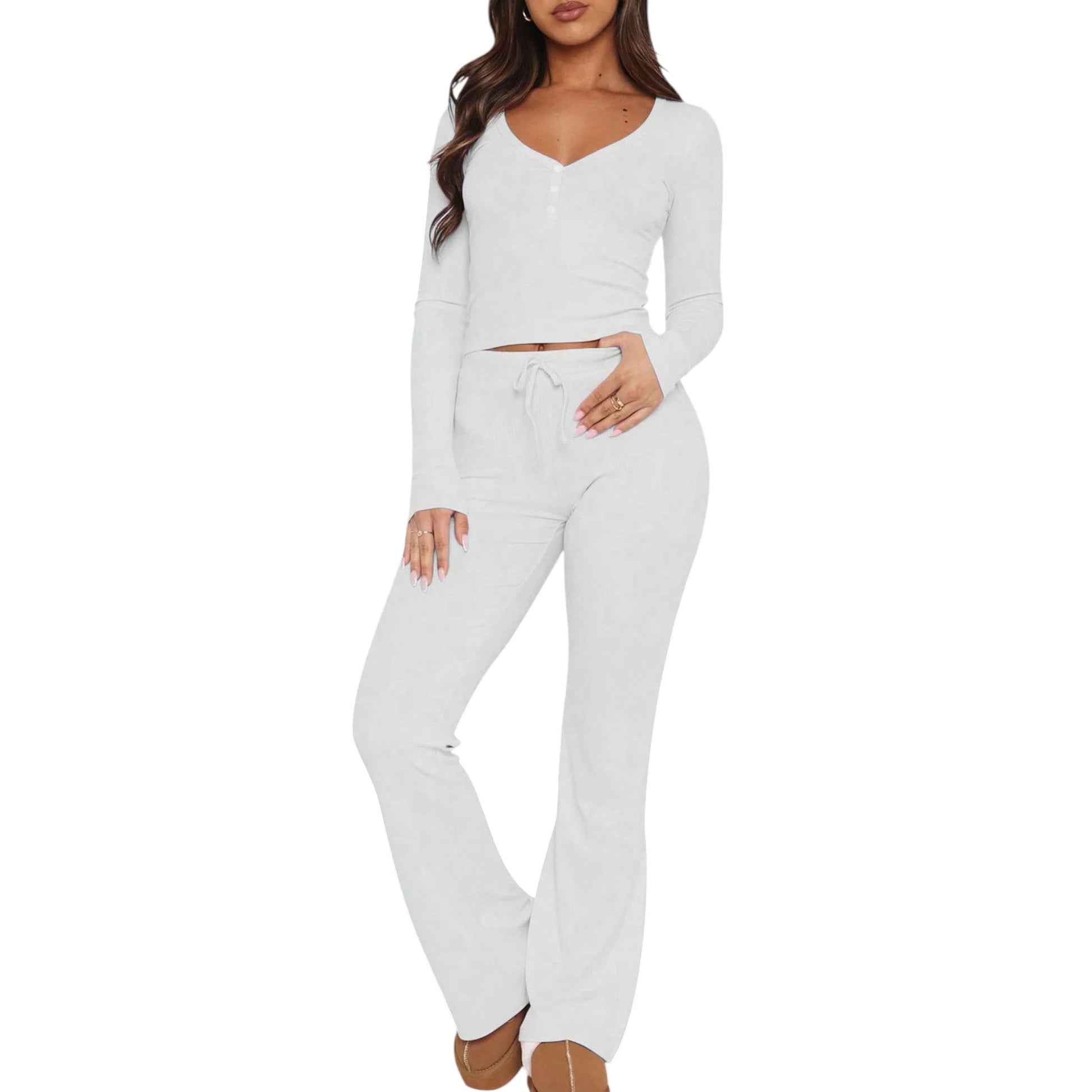 Címke nélküli, fehér, bordázott anyagú, hosszú ujjú, V-nyakú, gombos felső és hozzáillő bő szárú nadrág.