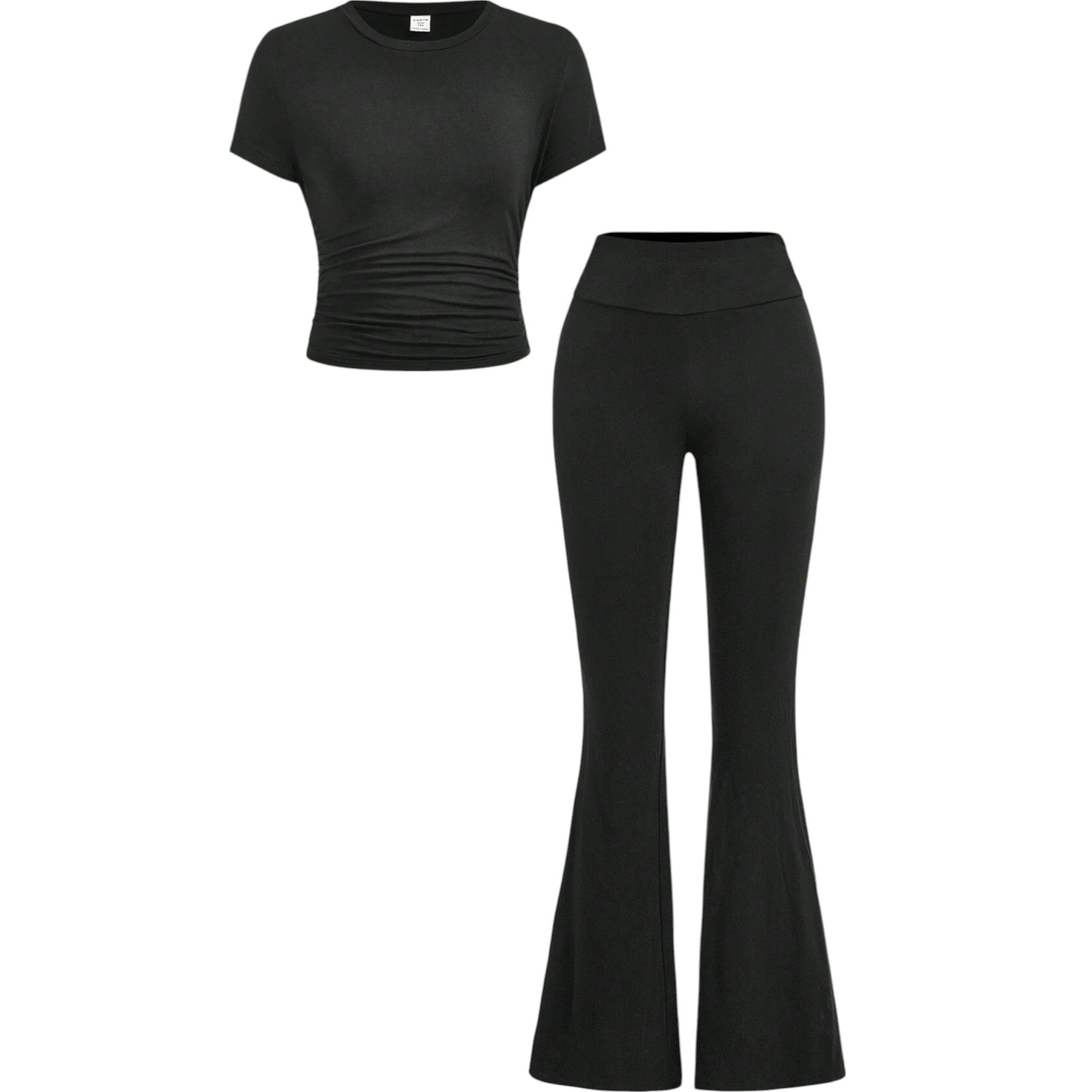 Címke nélküli, fekete, bordázott, rövid ujjú felső és flare nadrág szett.