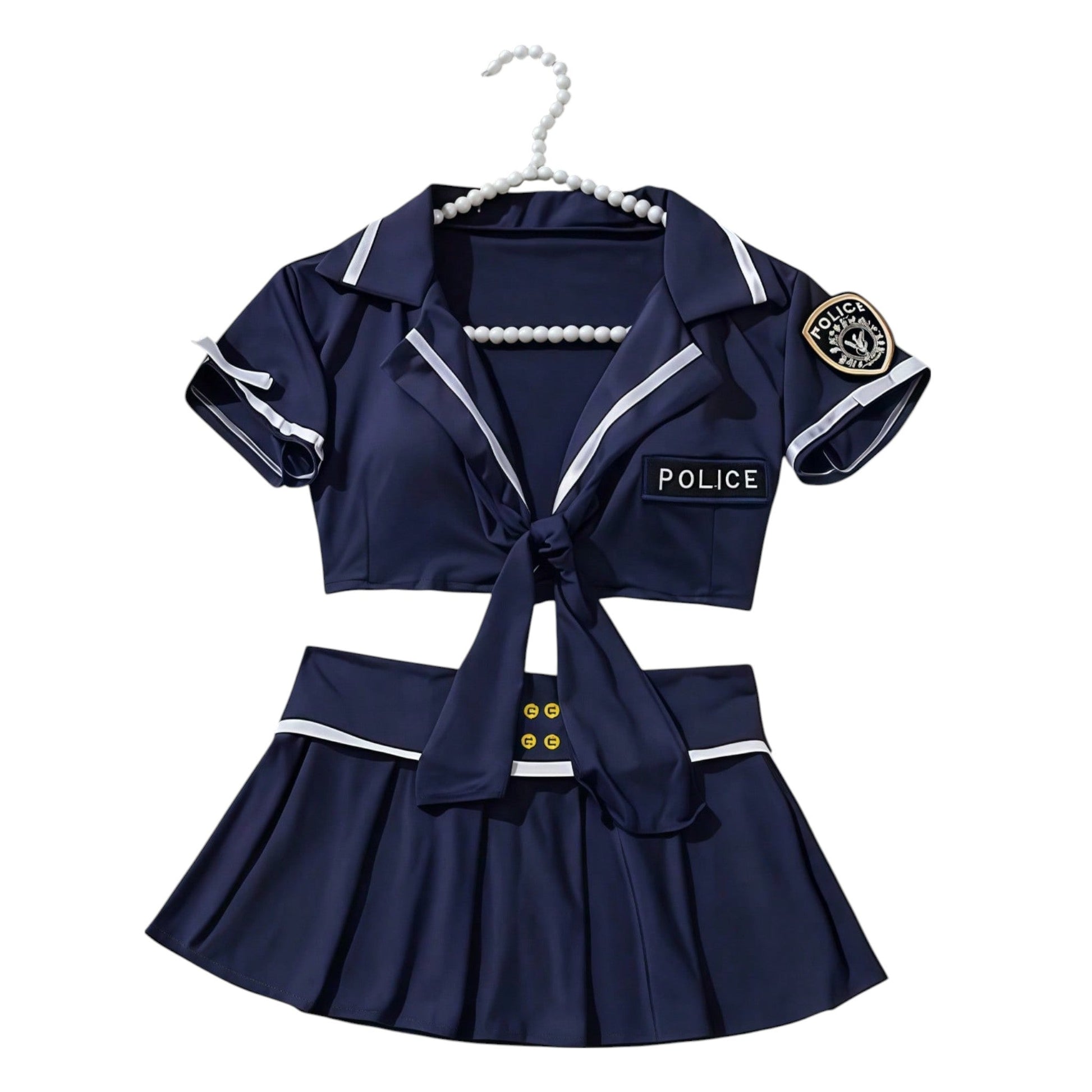 Címke nélküli, kék, kétrészes, rövid ujjú felső és mini szoknya, rendőrségi jelvényes.