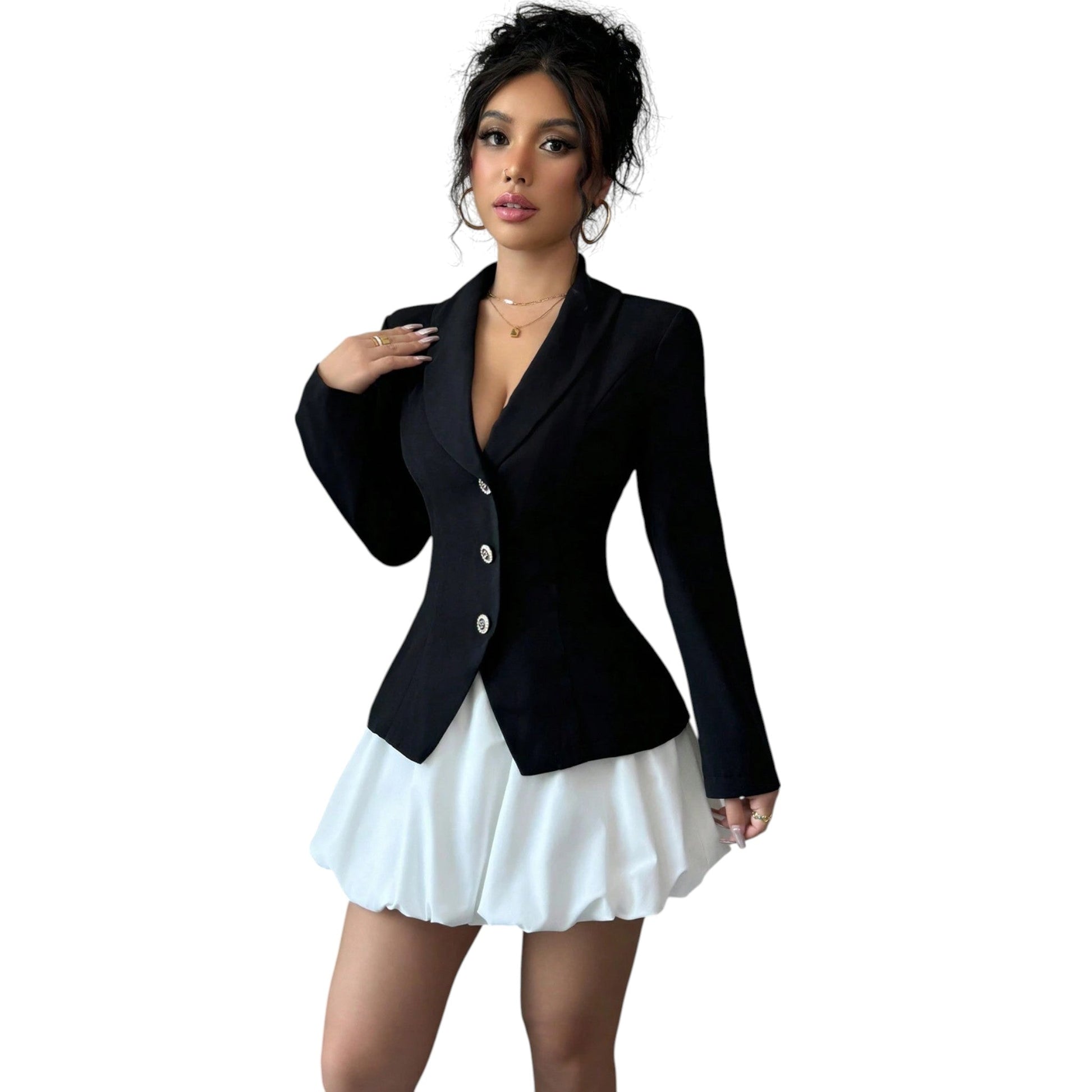 Címke nélküli, fekete, kétrészes, hosszú ujjú, blézeres ruha, fehér, fodros szoknyával.