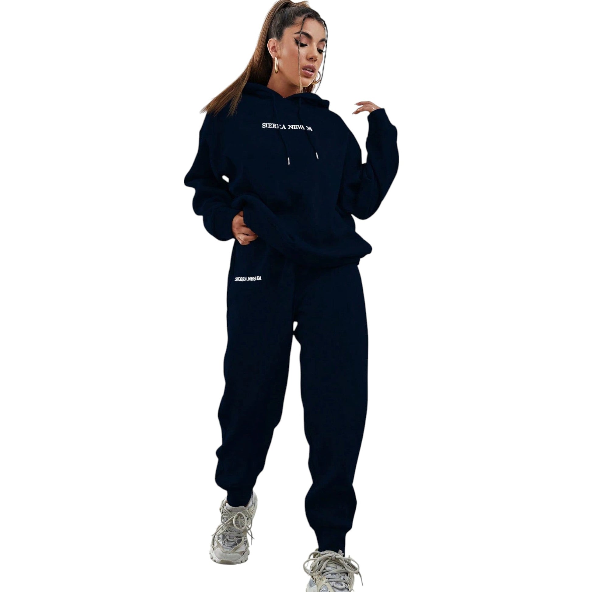 Címke nélküli, sötétkék, kapucnis pulóver és melegítő nadrág szett, pulóver kenguru zsebbel, nadrág gumis derékkal és passzéval.