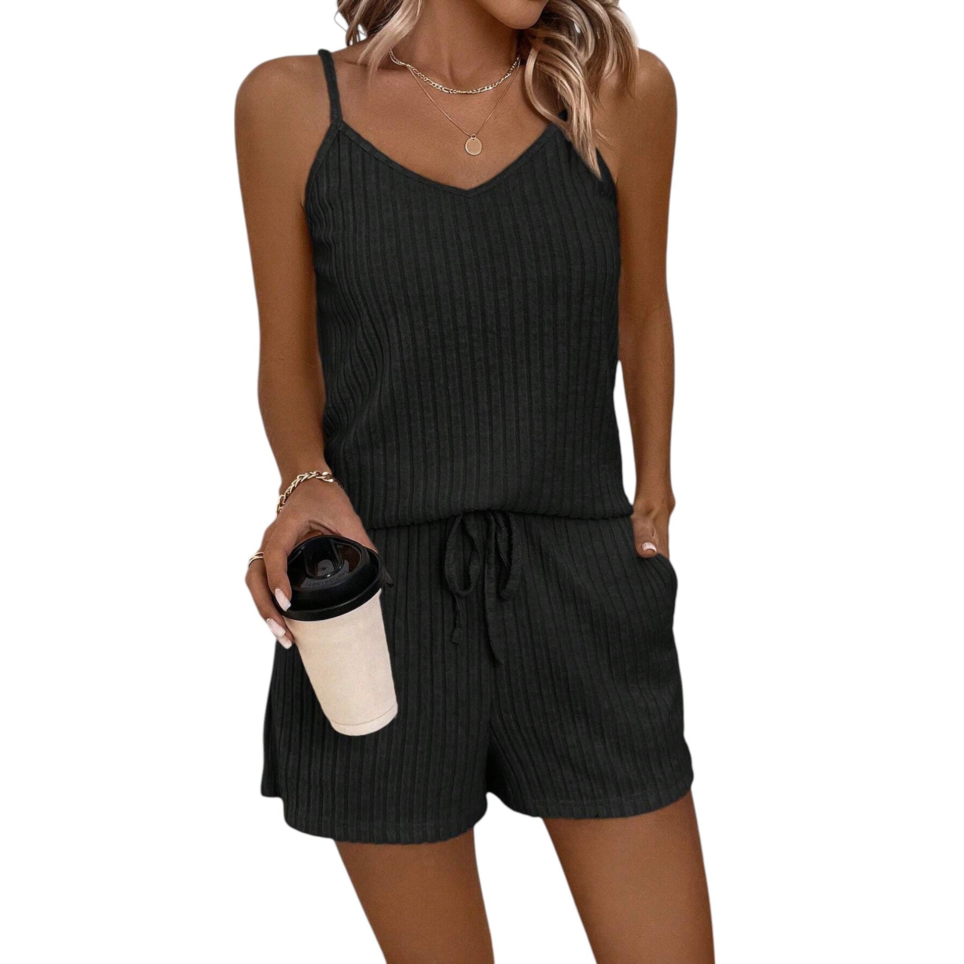 Címke nélküli, fekete, bordázott anyagú, vékony pántos, V-nyakú top és rövidnadrág szett, húzott derekú rövidnadrág oldalt zsebekkel.