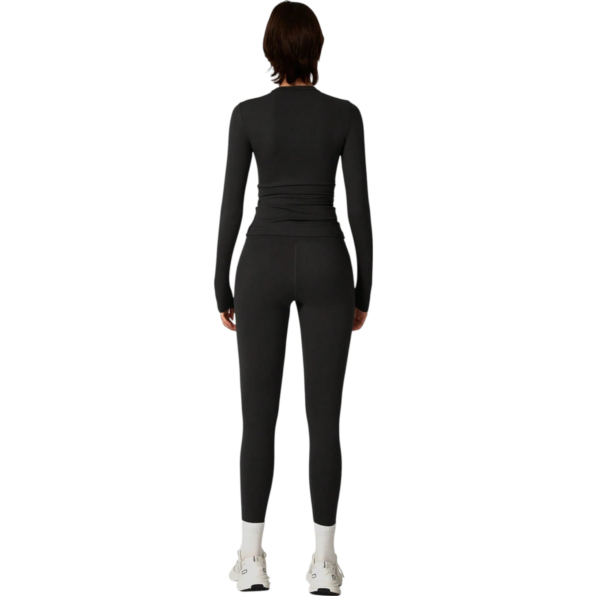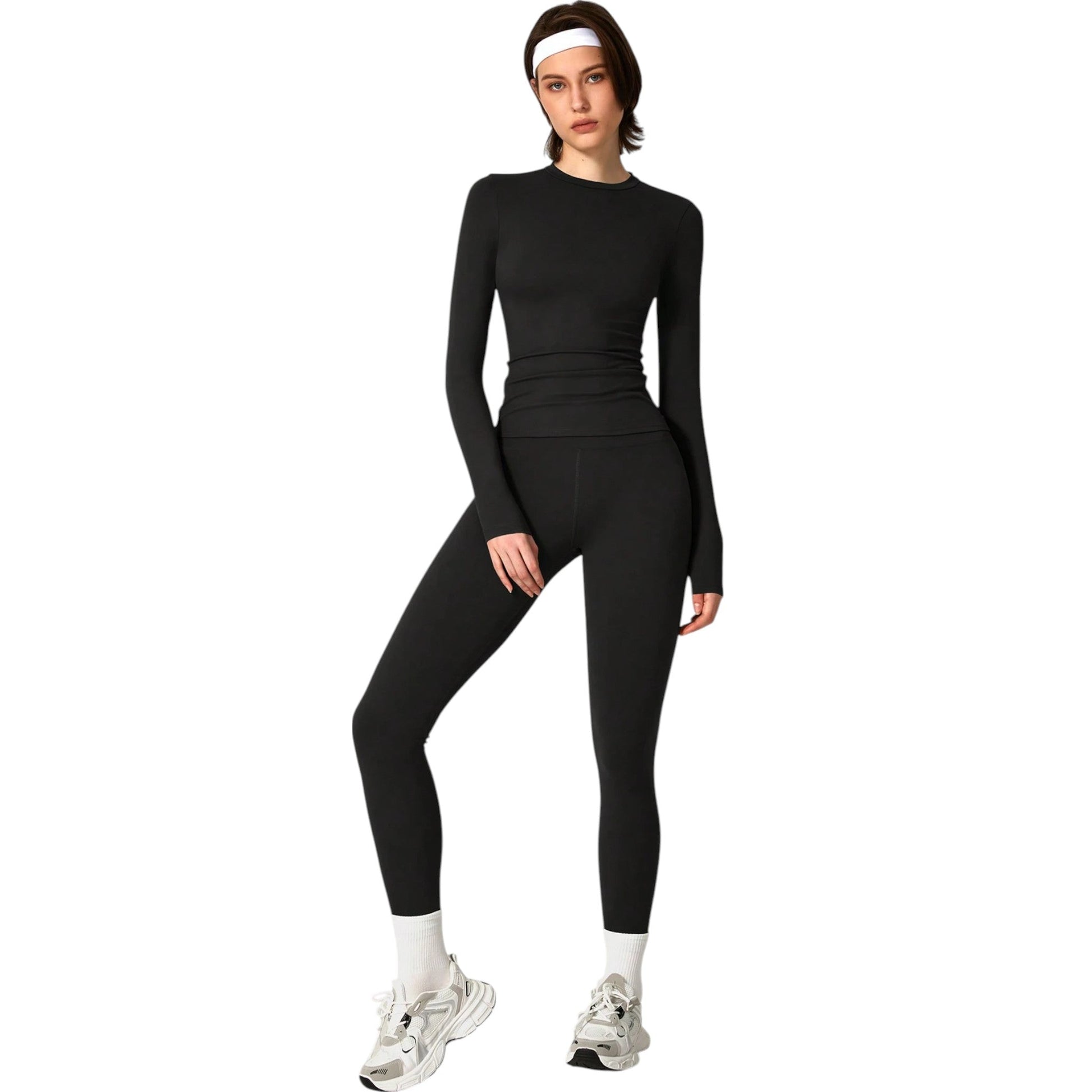 Címke nélküli, fekete, varrás nélküli sport szett, hosszú ujjú, kerek nyakú felsővel és magas derekú leggingsszel.