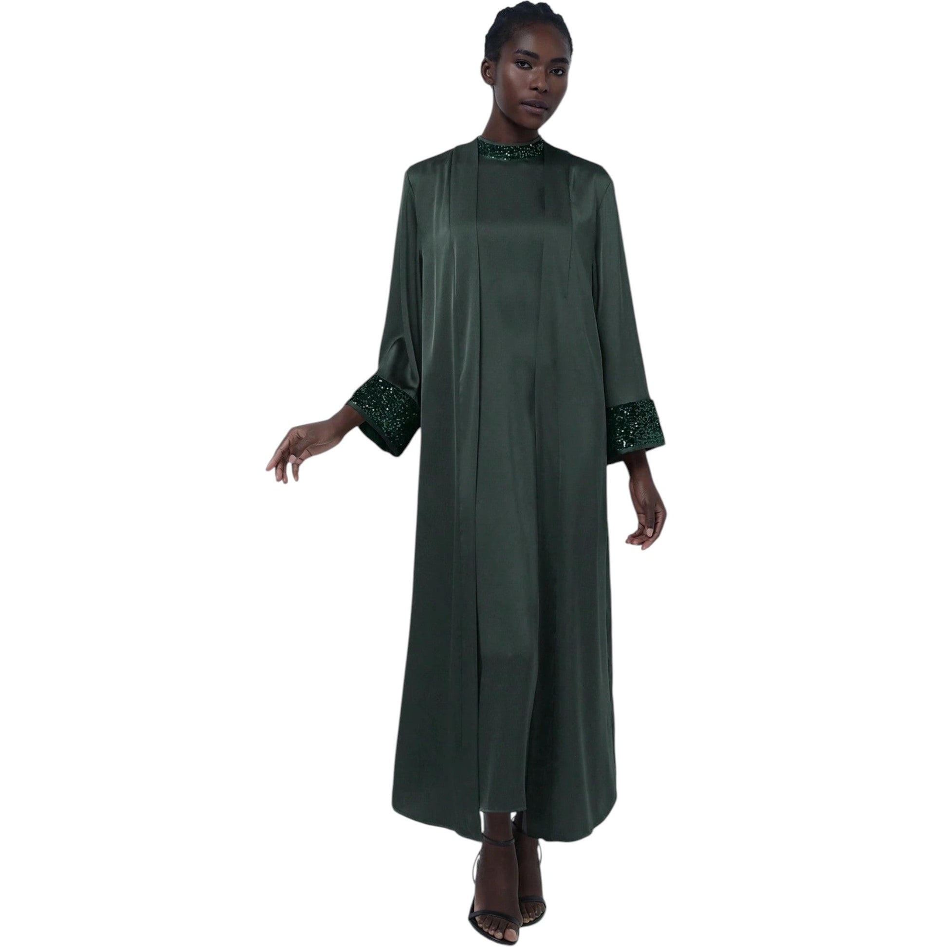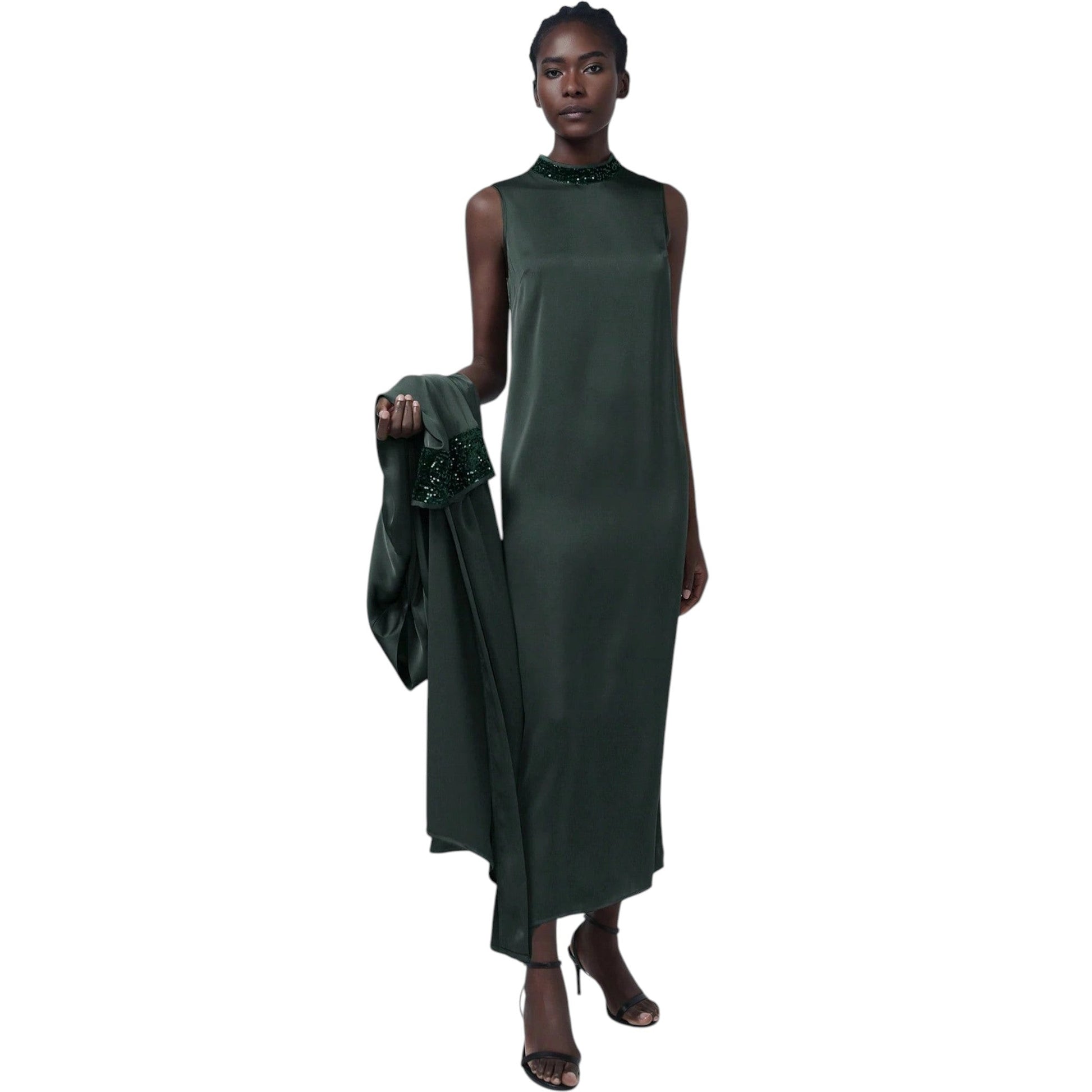 Címke nélküli, smaragdzöld, hosszú ujjú, galléros maxi ruha, flitteres díszítéssel a galléron és az ujjakon.