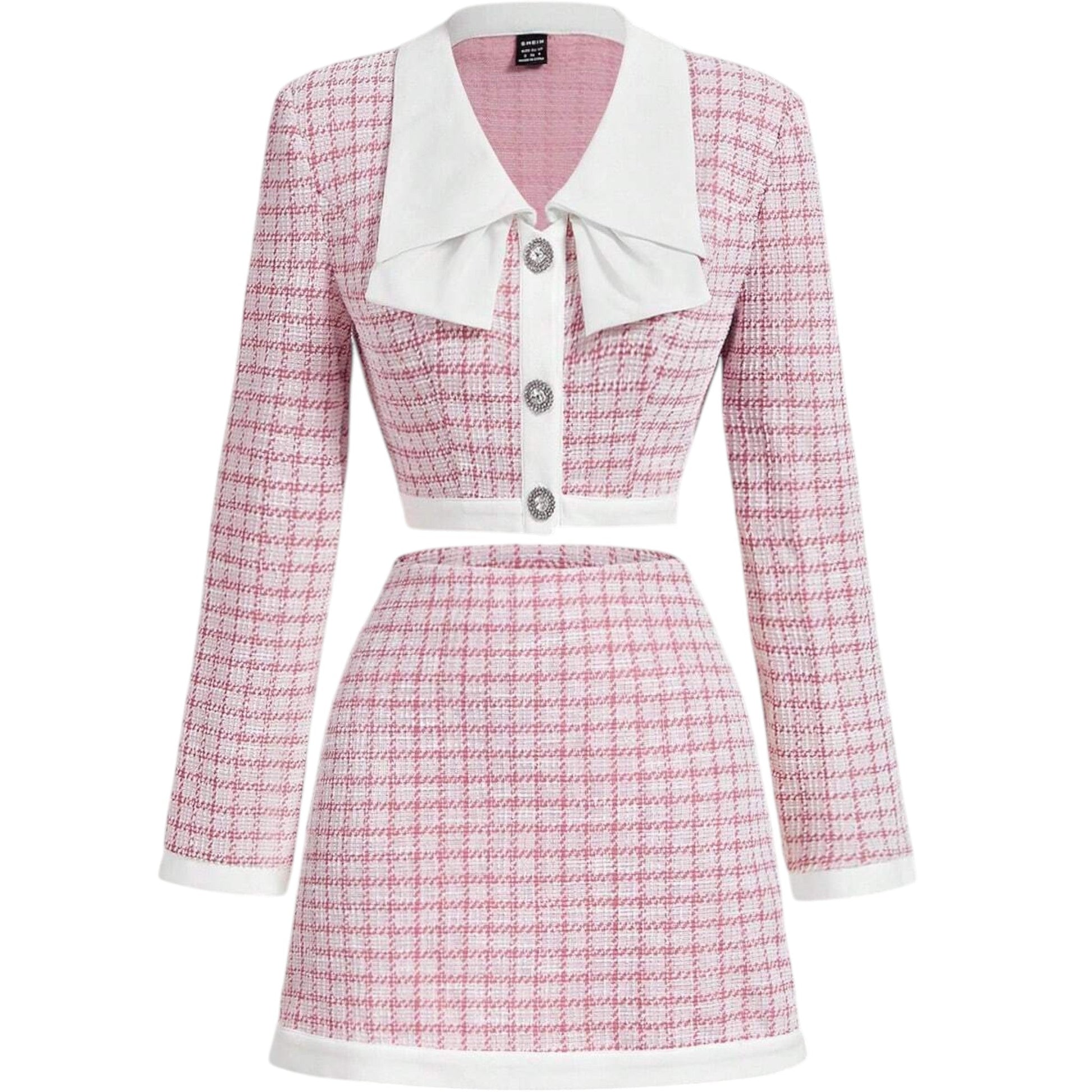 Címke nélküli, rózsaszín és fehér kockás, tweed anyagú, kétrészes szett, cropped blézer masni díszítéssel és gallérral, valamint egy rövid szoknya.