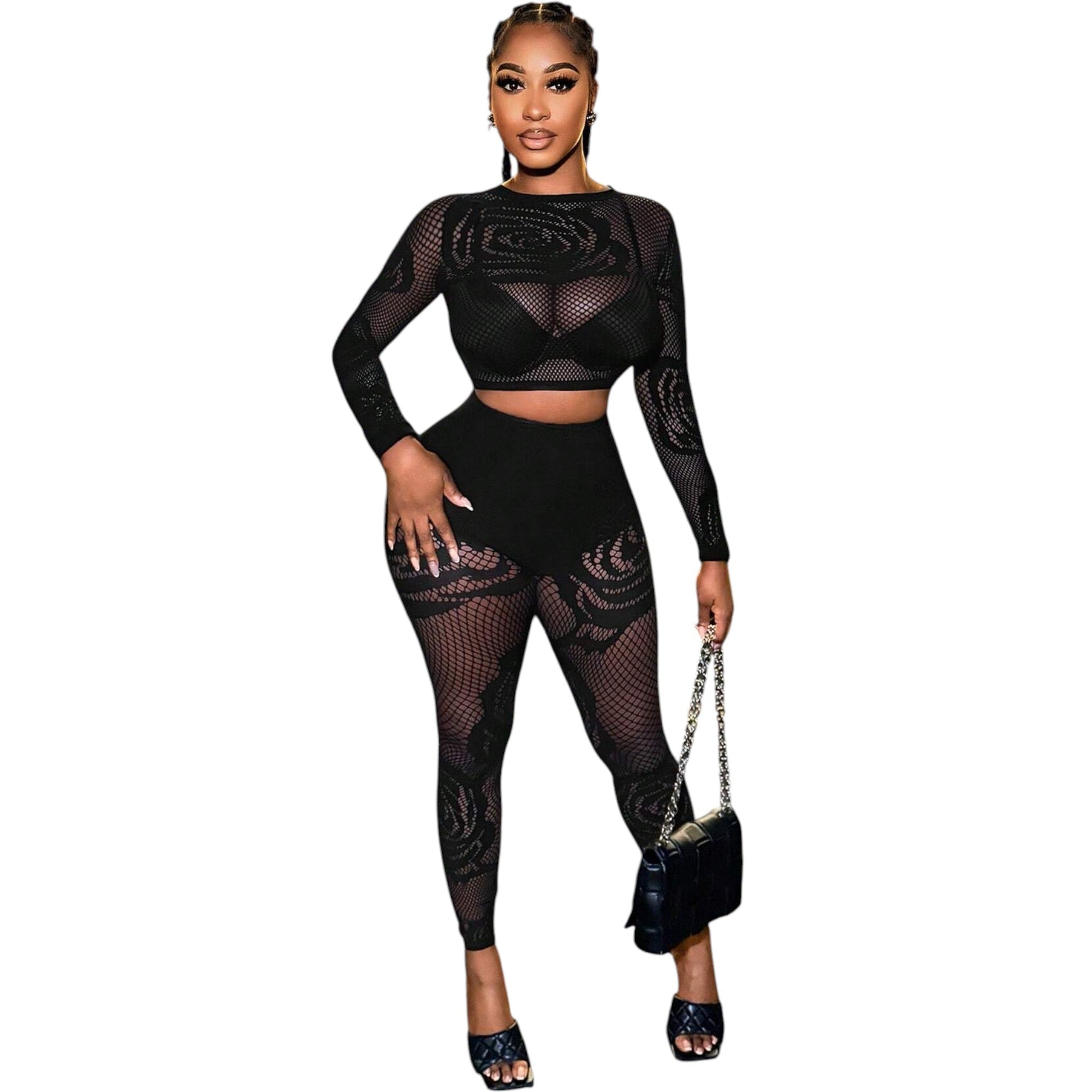 Címke nélküli, fekete, hálós, hosszú ujjú crop top és leggings szett.