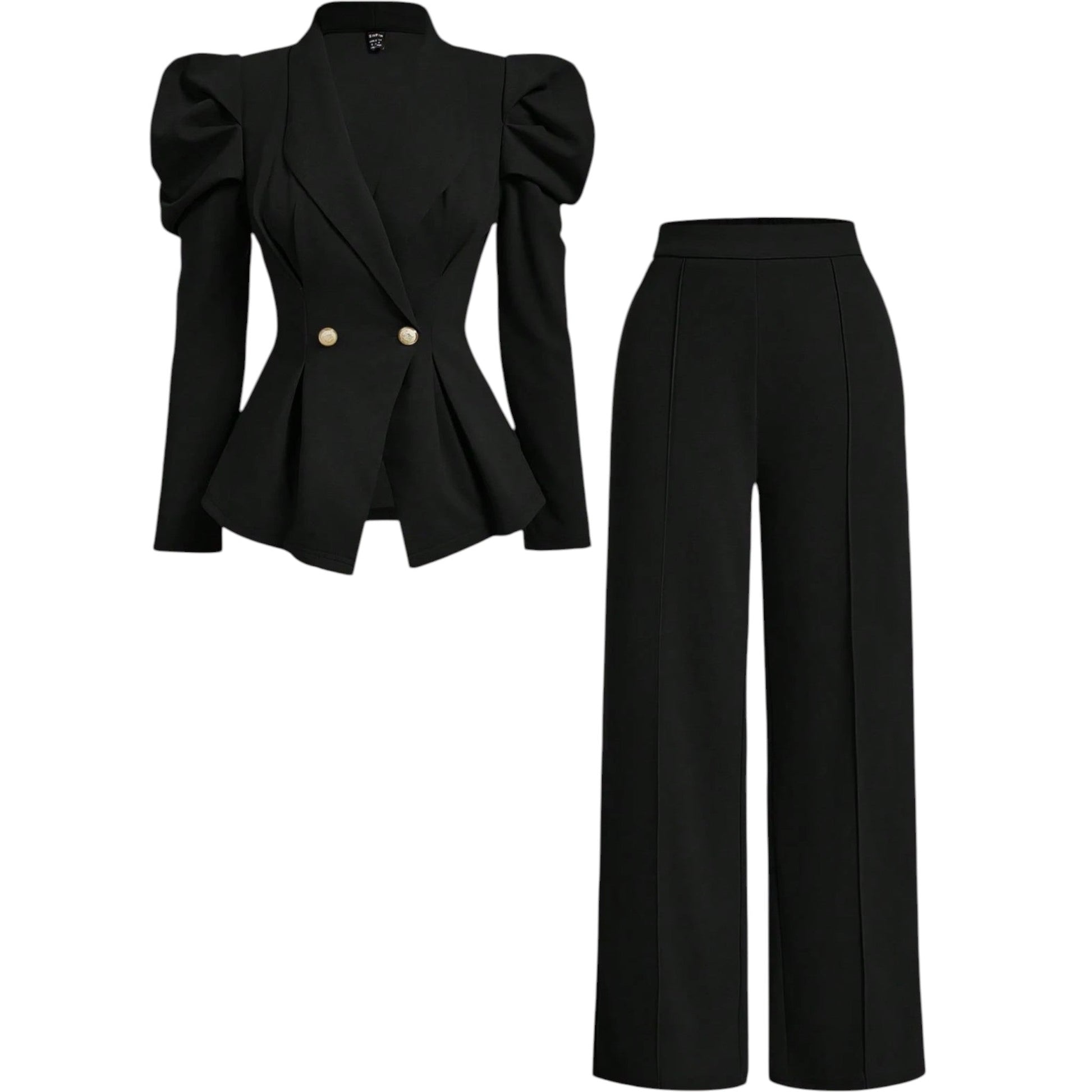 Címke nélküli, fekete, hosszú puffos ujjú blézer, V-nyakú, dupla gombsoros, aszimmetrikus aljú, hozzáillő magas derekú, széles szárú nadrág.