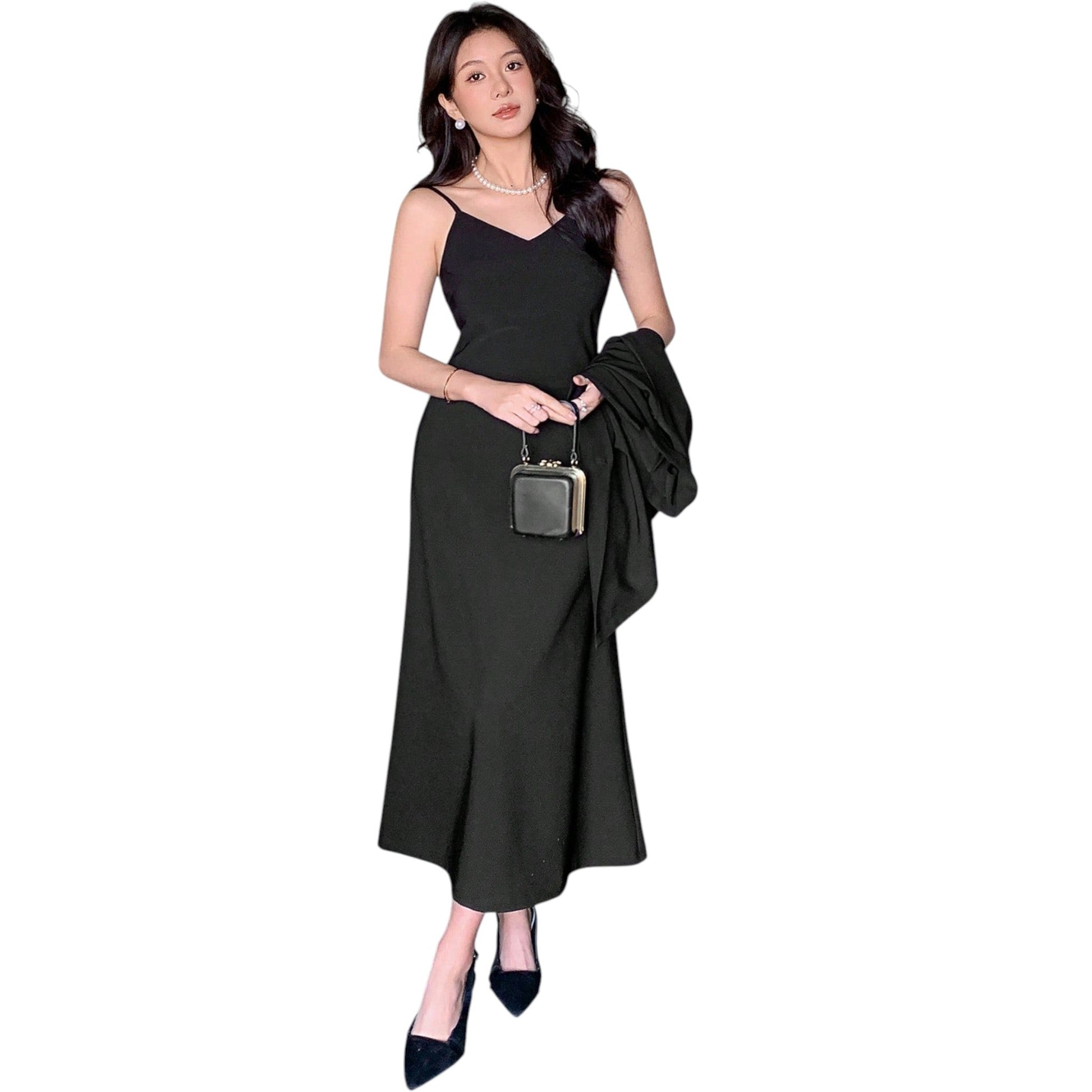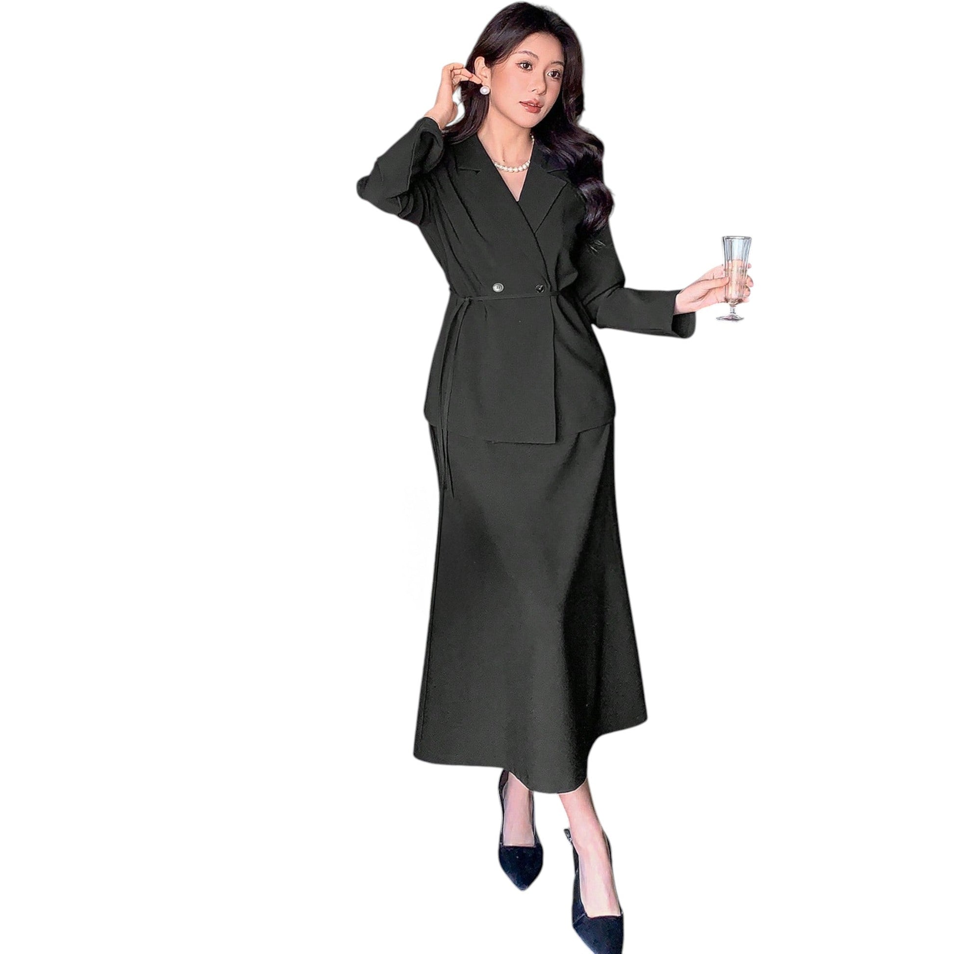 Címke nélküli, fekete, hosszú ujjú, galléros, V-nyakú, kétsoros gombokkal, megkötős derékkal, hosszú szoknyával.