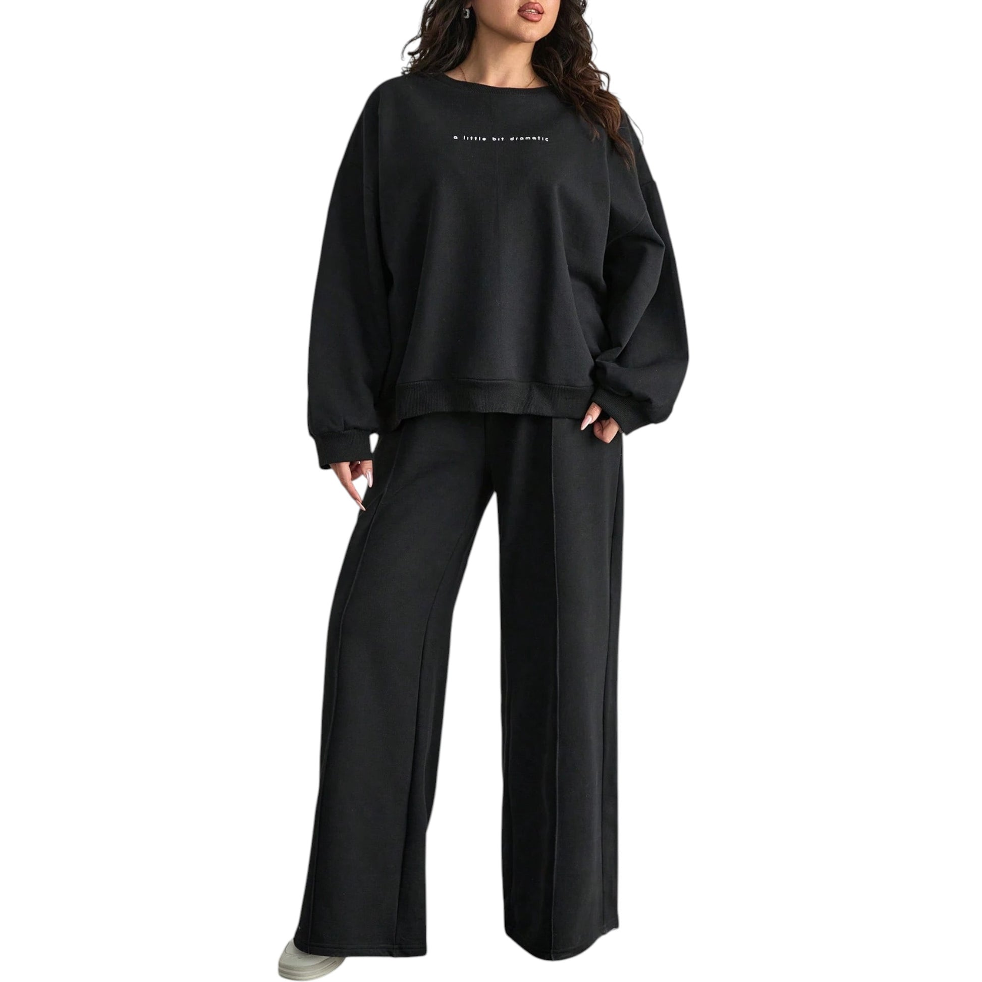 Címke nélküli, fekete, hosszú ujjú, kerek nyakú, bő felső és bő szárú, egyenes nadrág szett, mintás felirattal.
