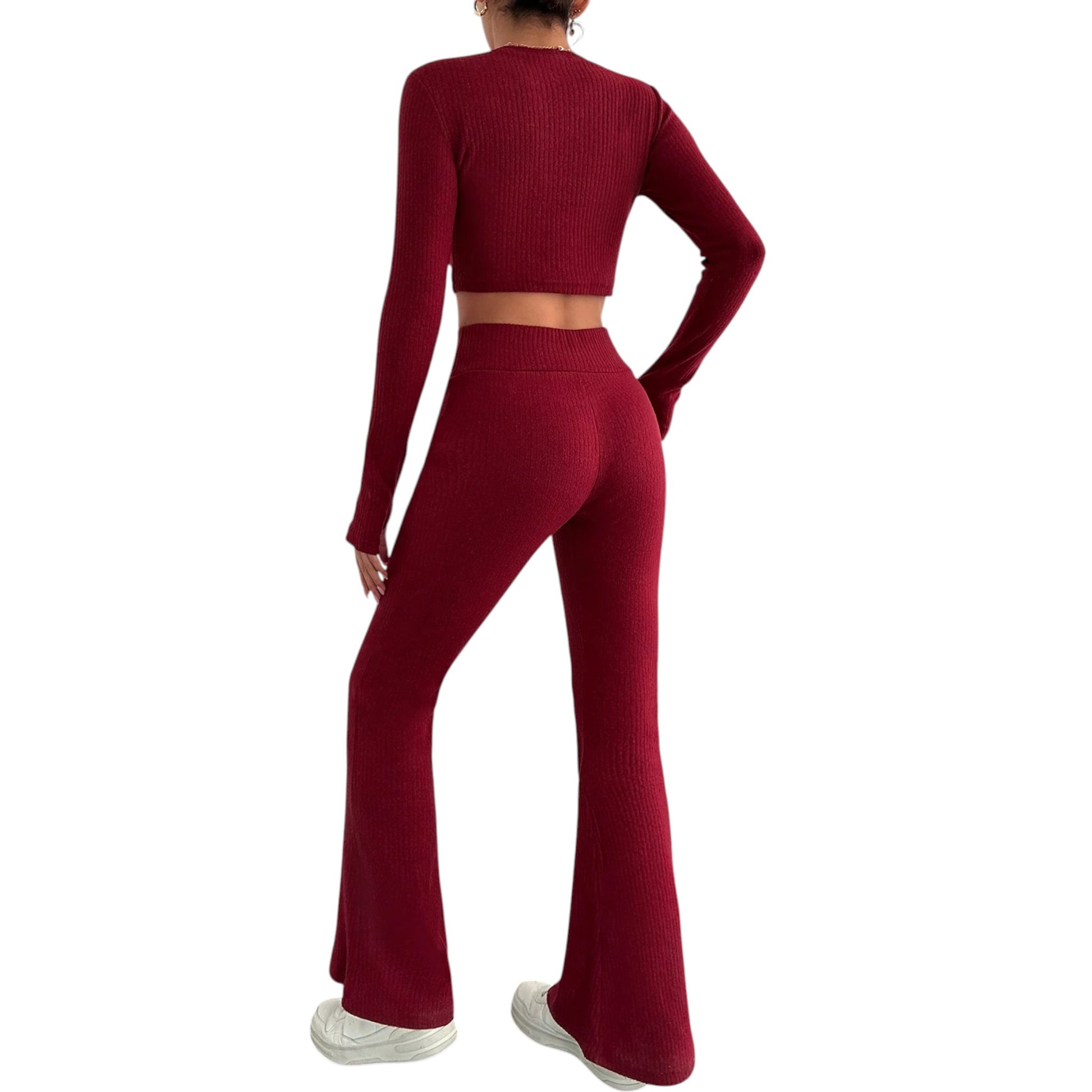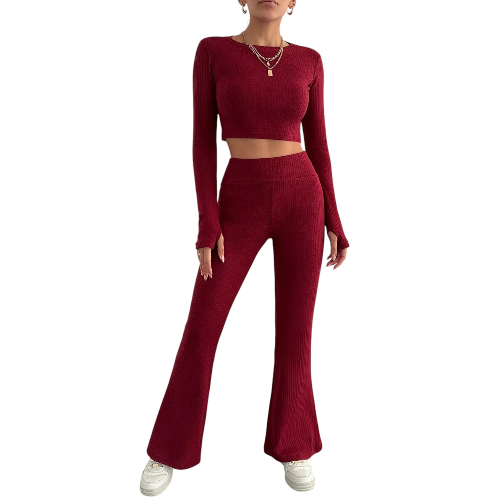 Címke nélküli, bordó, hosszú ujjú, kerek nyakú, rövid felső és trapéz szárú, kötött nadrág szett.
