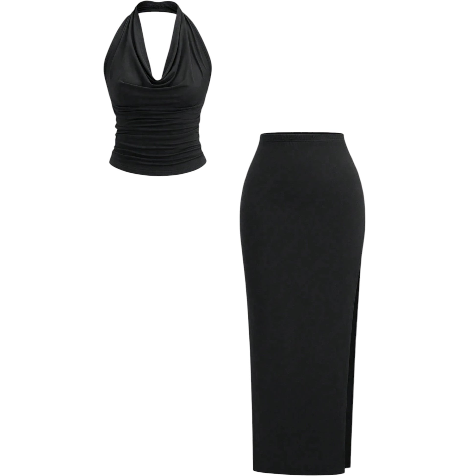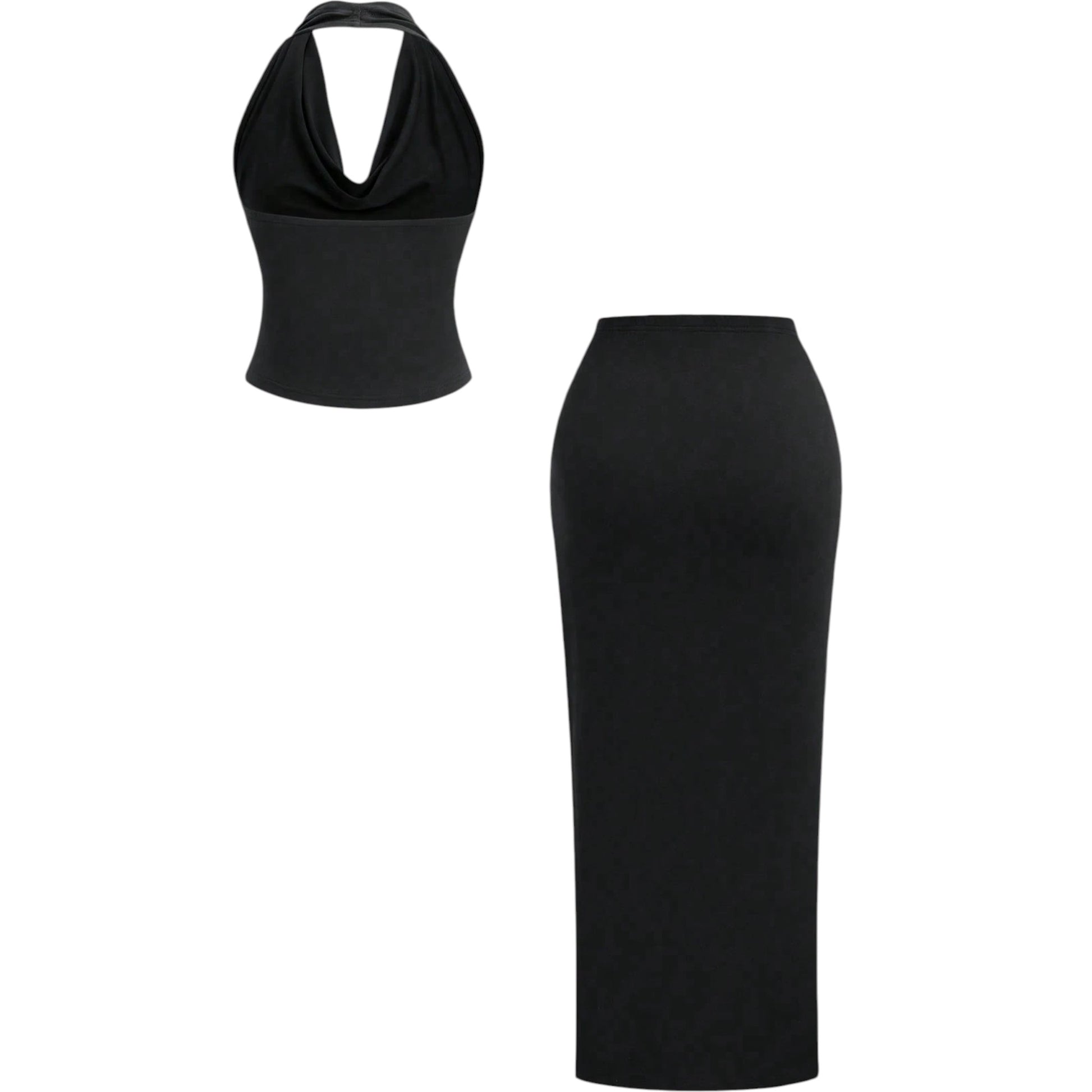 Címke nélküli, fekete, kétrészes szett, redőzött, pánt nélküli felsővel, és egy hasított, magas derekú, testhezálló szoknyával.