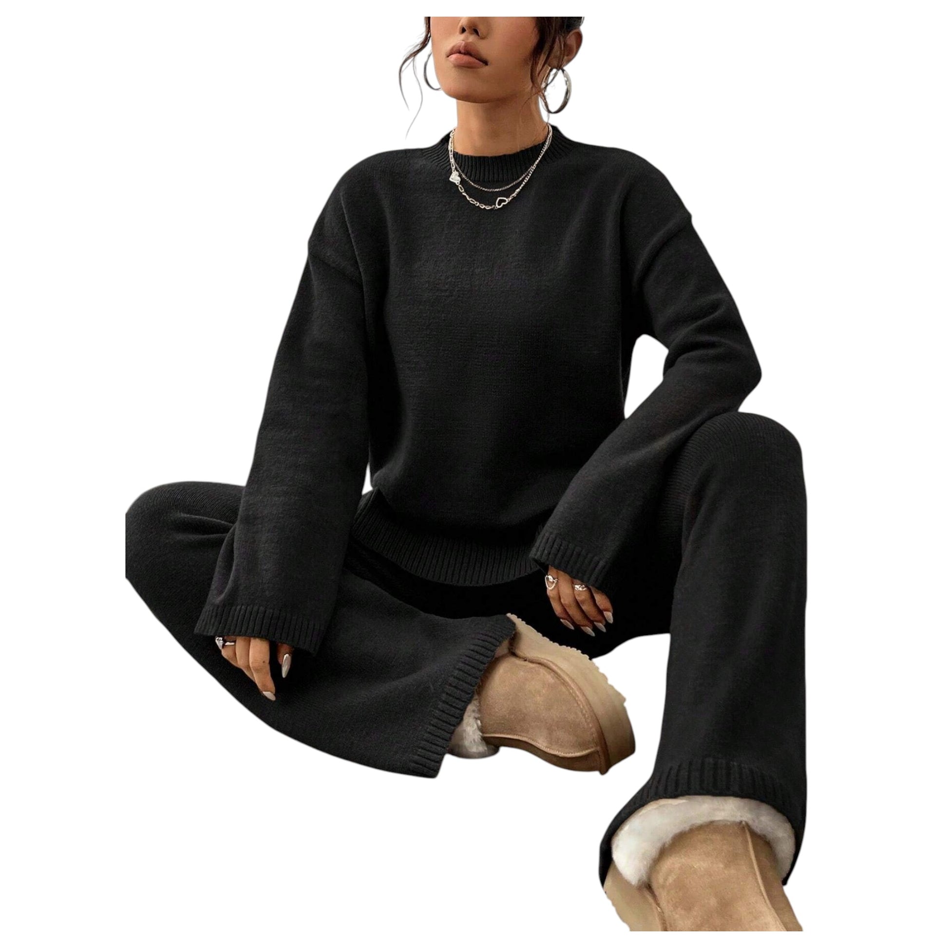 Címke nélküli, fekete, hosszú ujjú, kerek nyakú, kötött pulóver és bő szárú nadrág szett.