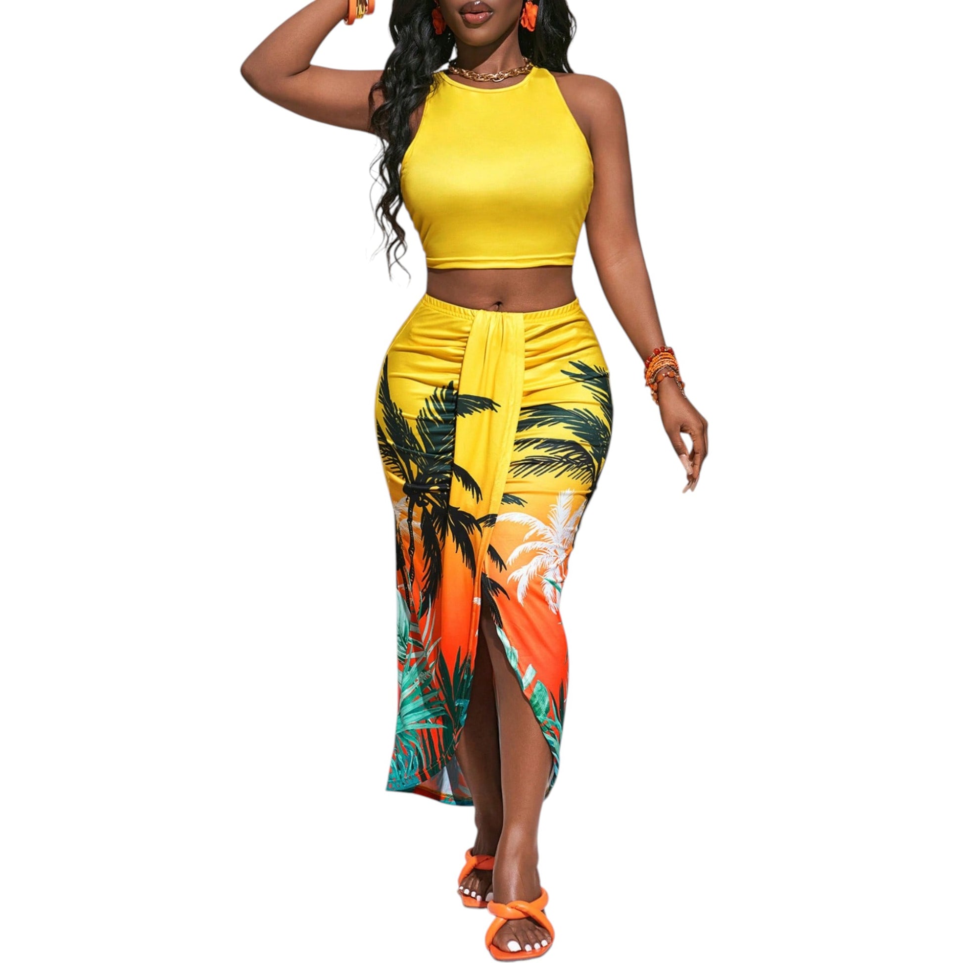 Címke nélküli, sárga, ujjatlan, garbó nyakú, rövid top, valamint egy magas derekú, hasított, tropikus mintás, hosszú szoknya.