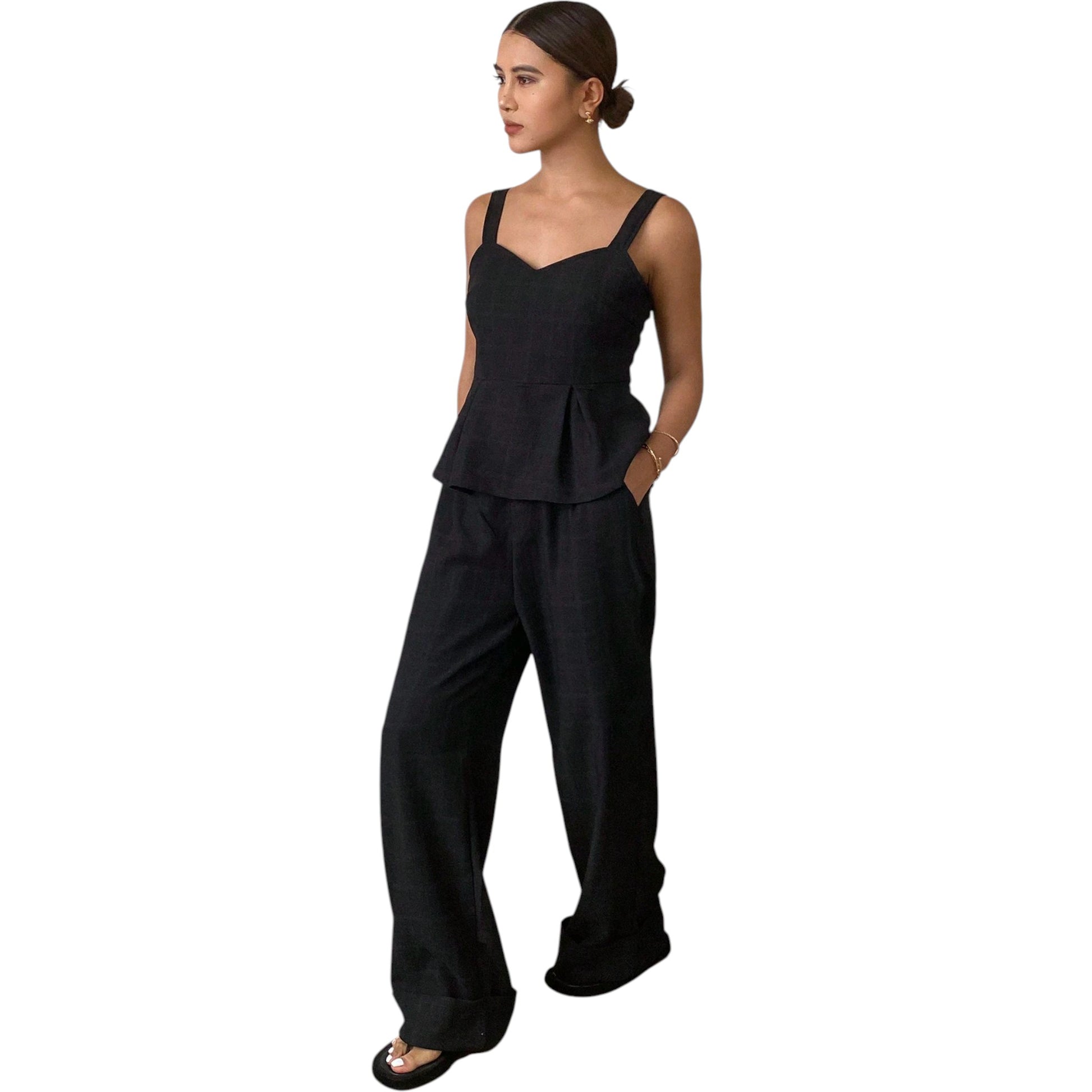 Címke nélküli, fekete, kétrészes szett, ujjatlan peplum felsővel és bő szárú nadrággal.